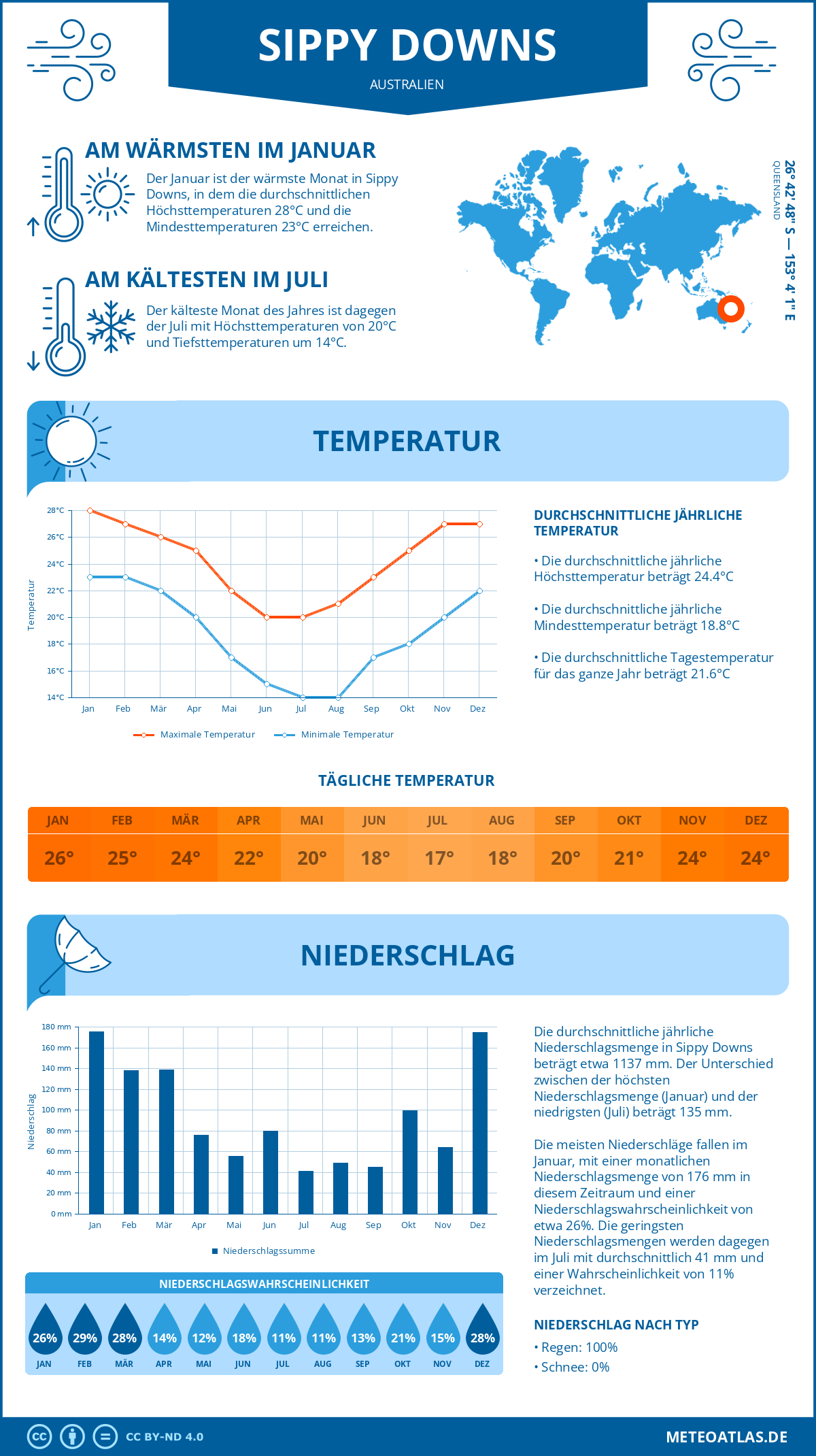 Sippy Downs weist eine durchschnittliche Tagestemperatur von 24°C im Jahresmittel auf, während die nächtliche Temperatur auf etwa 19°C. Die durchschnittliche Temperatur über den gesamten Tagesverlauf beträgt 22°C.