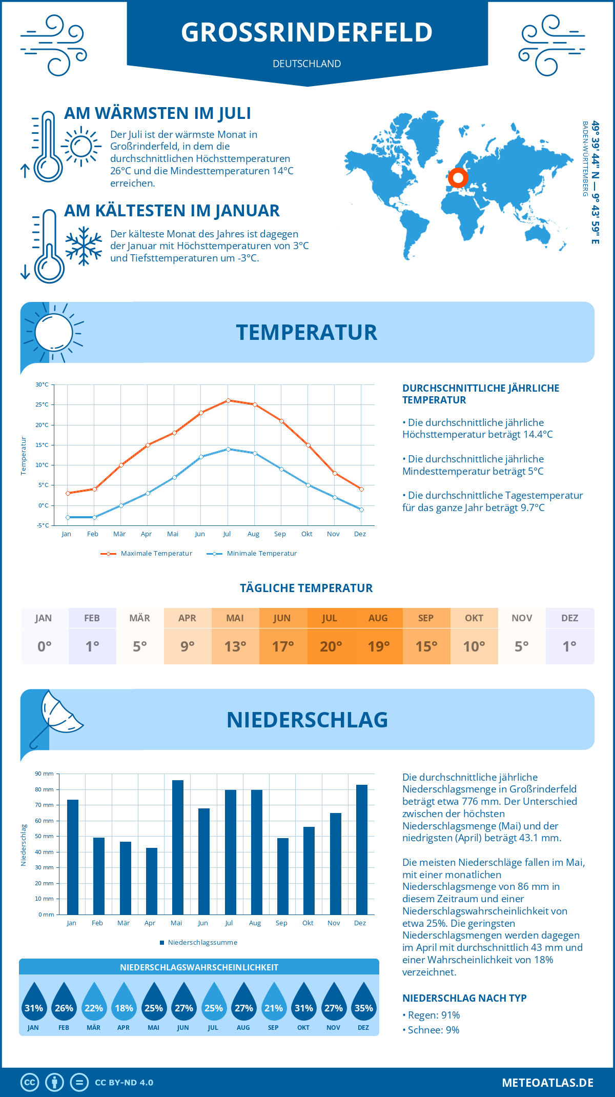 Großrinderfeld weist eine durchschnittliche Tagestemperatur von 14°C im Jahresmittel auf, während die nächtliche Temperatur auf etwa 5°C. Die durchschnittliche Temperatur über den gesamten Tagesverlauf beträgt 10°C.