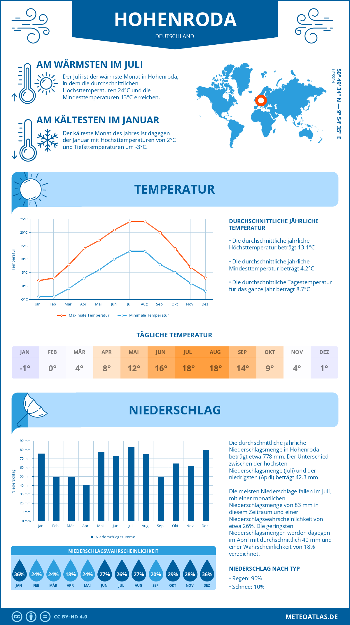 Hohenroda (Deutschland) - Wetter und Klima im Jahresverlauf: Durchschnittswerte für Temperatur und Niederschlag