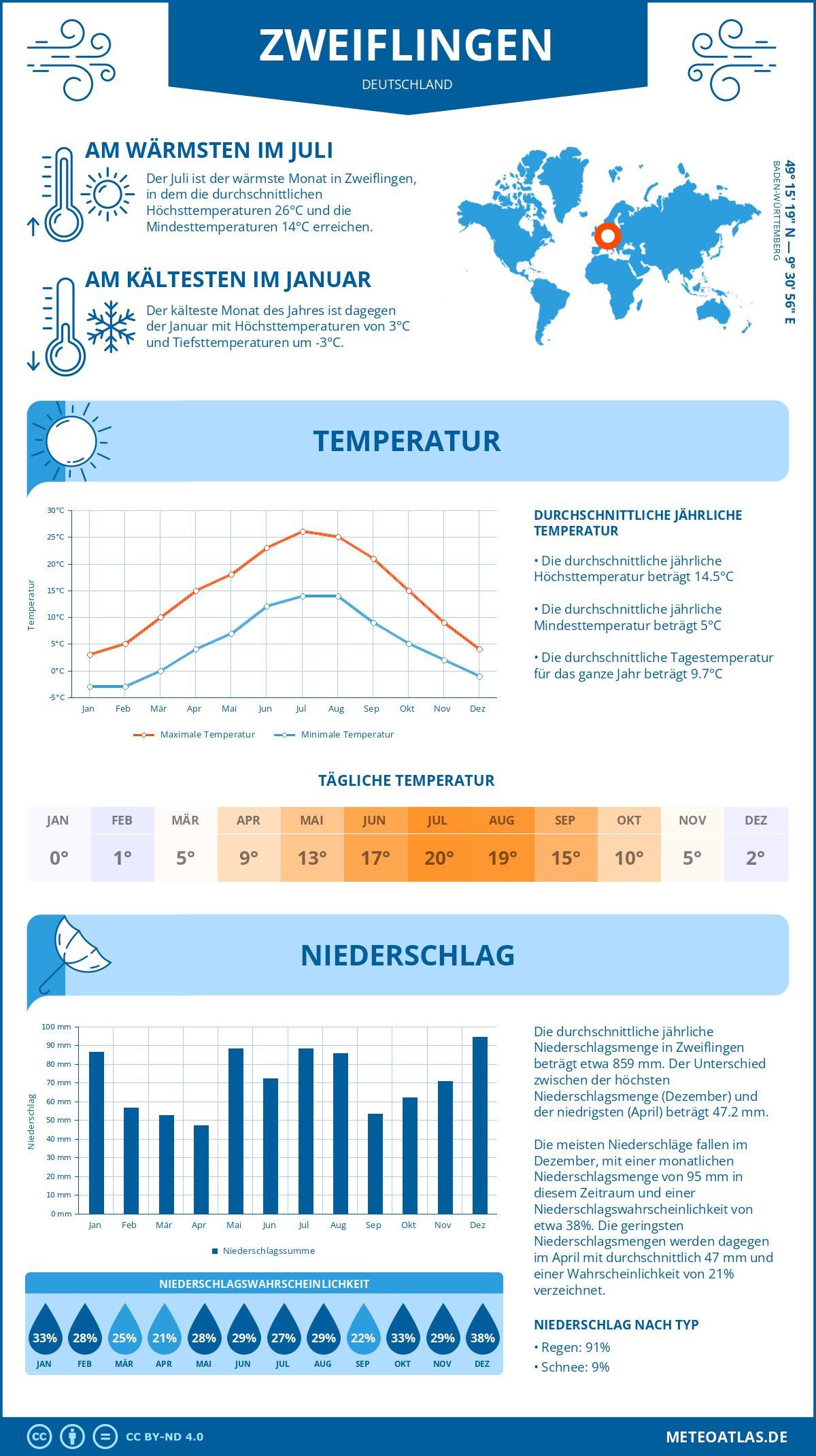 Infografik: Klima sowie monatliche Durchschnittstemperaturen und Niederschläge