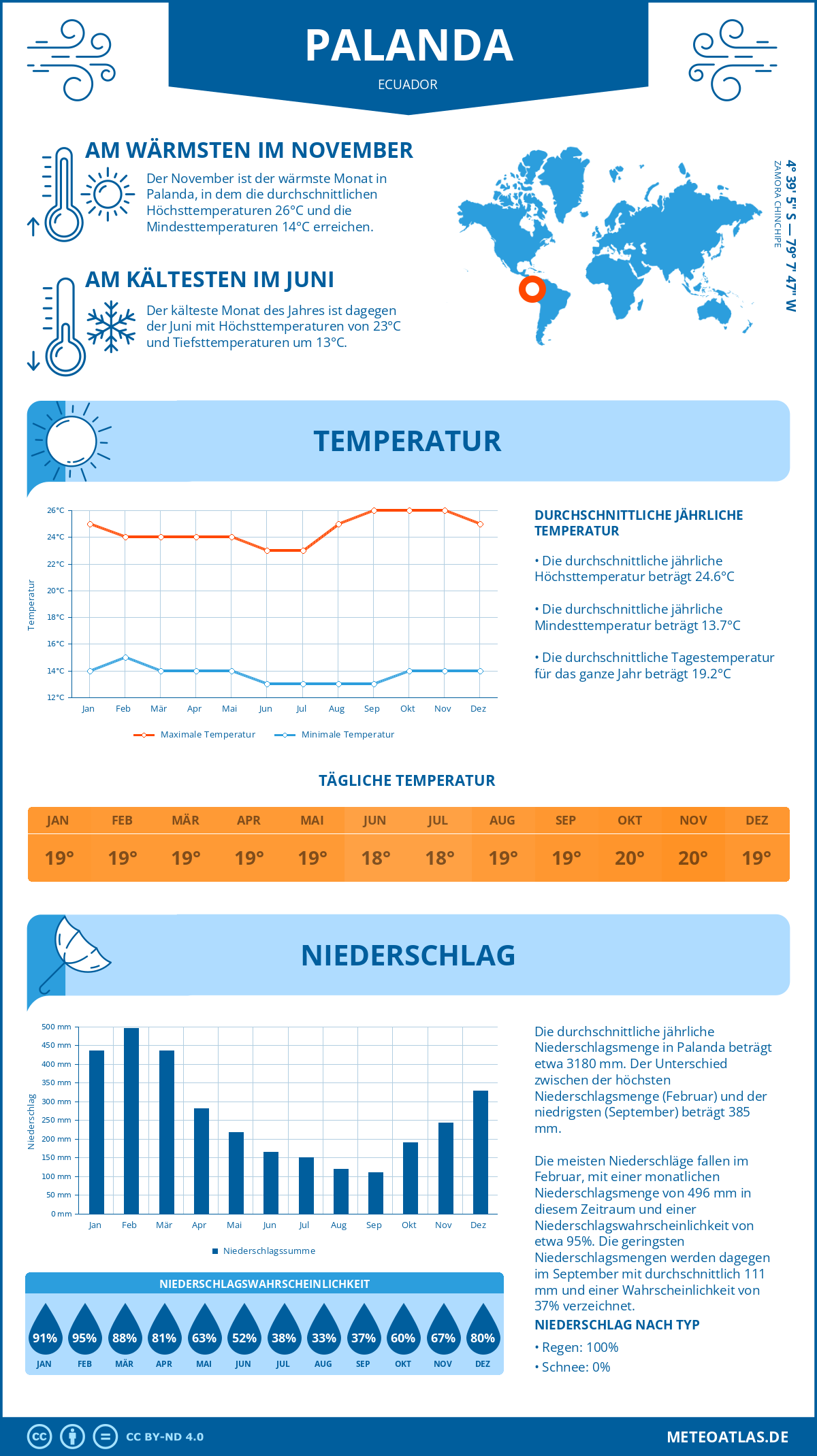 Palanda weist eine durchschnittliche Tagestemperatur von 25°C im Jahresmittel auf, während die nächtliche Temperatur auf etwa 14°C. Die durchschnittliche Temperatur über den gesamten Tagesverlauf beträgt 19°C.
