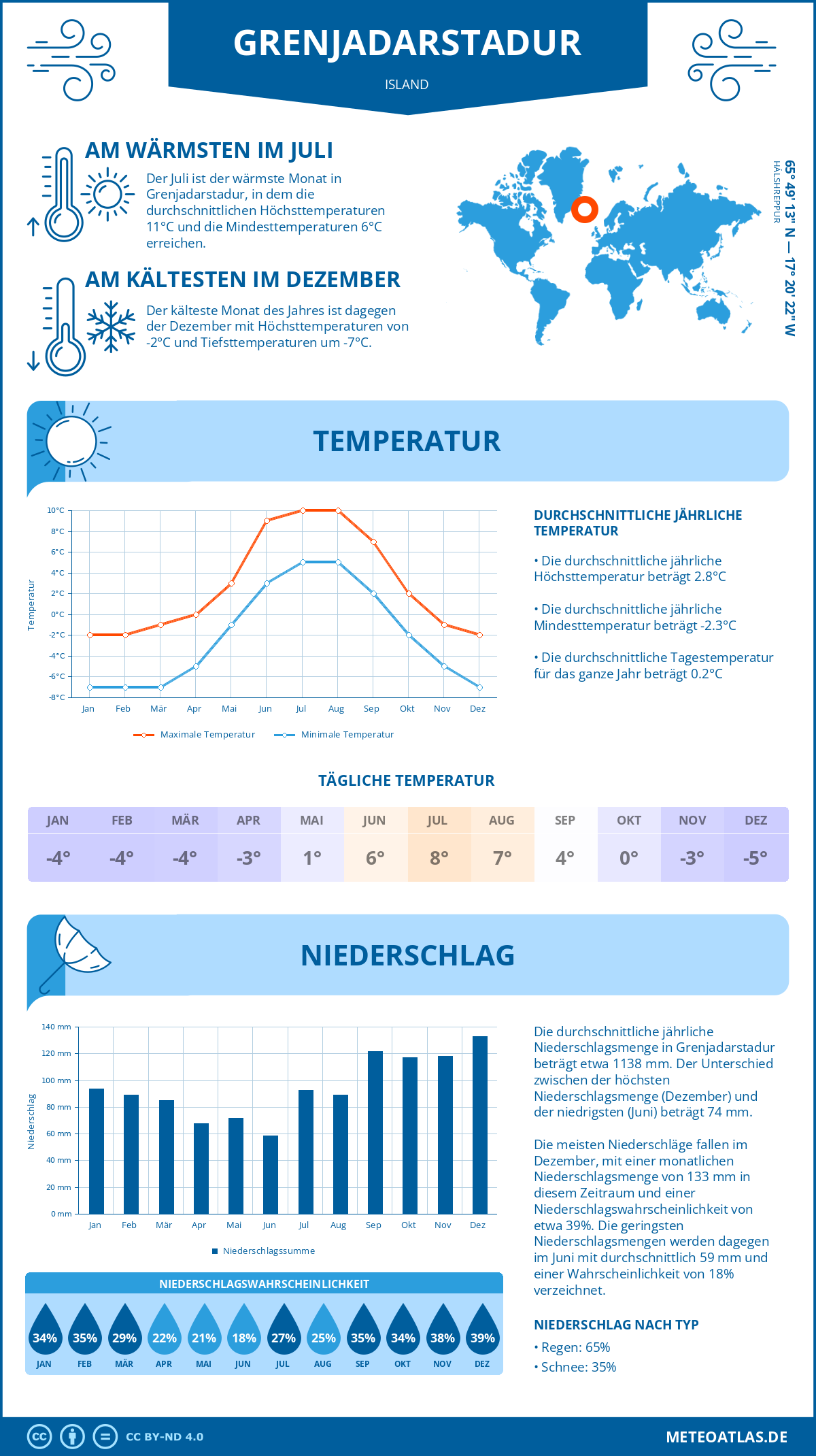 Grenjadarstadur (Island) - Wetter und Klima im Jahresverlauf: Durchschnittswerte für Temperatur und Niederschlag