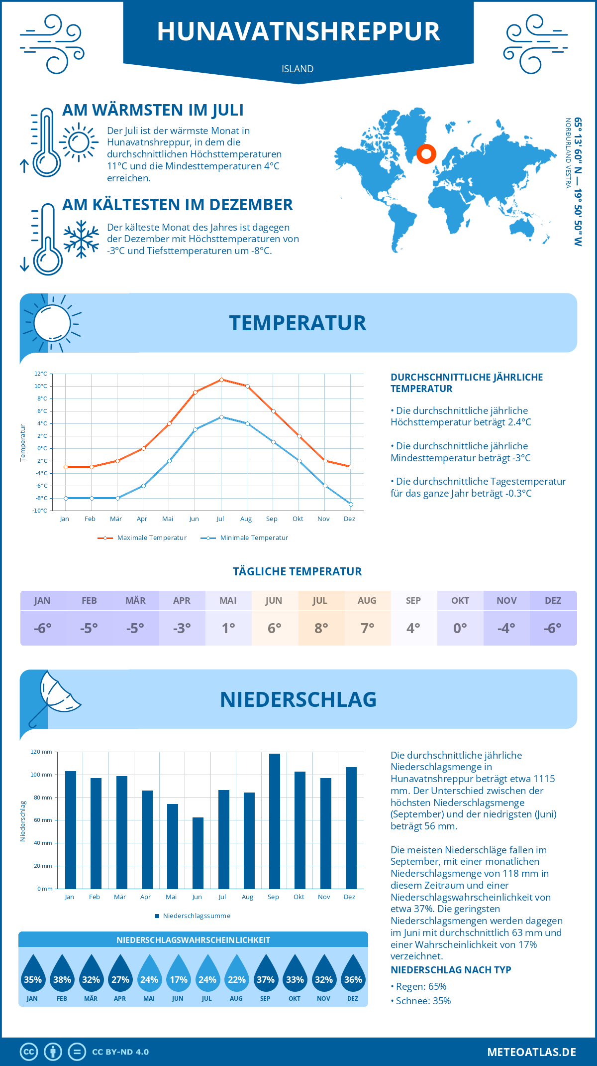 Hunavatnshreppur weist eine durchschnittliche Tagestemperatur von 2°C im Jahresmittel auf, während die nächtliche Temperatur auf etwa -3°C. Die durchschnittliche Temperatur über den gesamten Tagesverlauf beträgt 0°C.