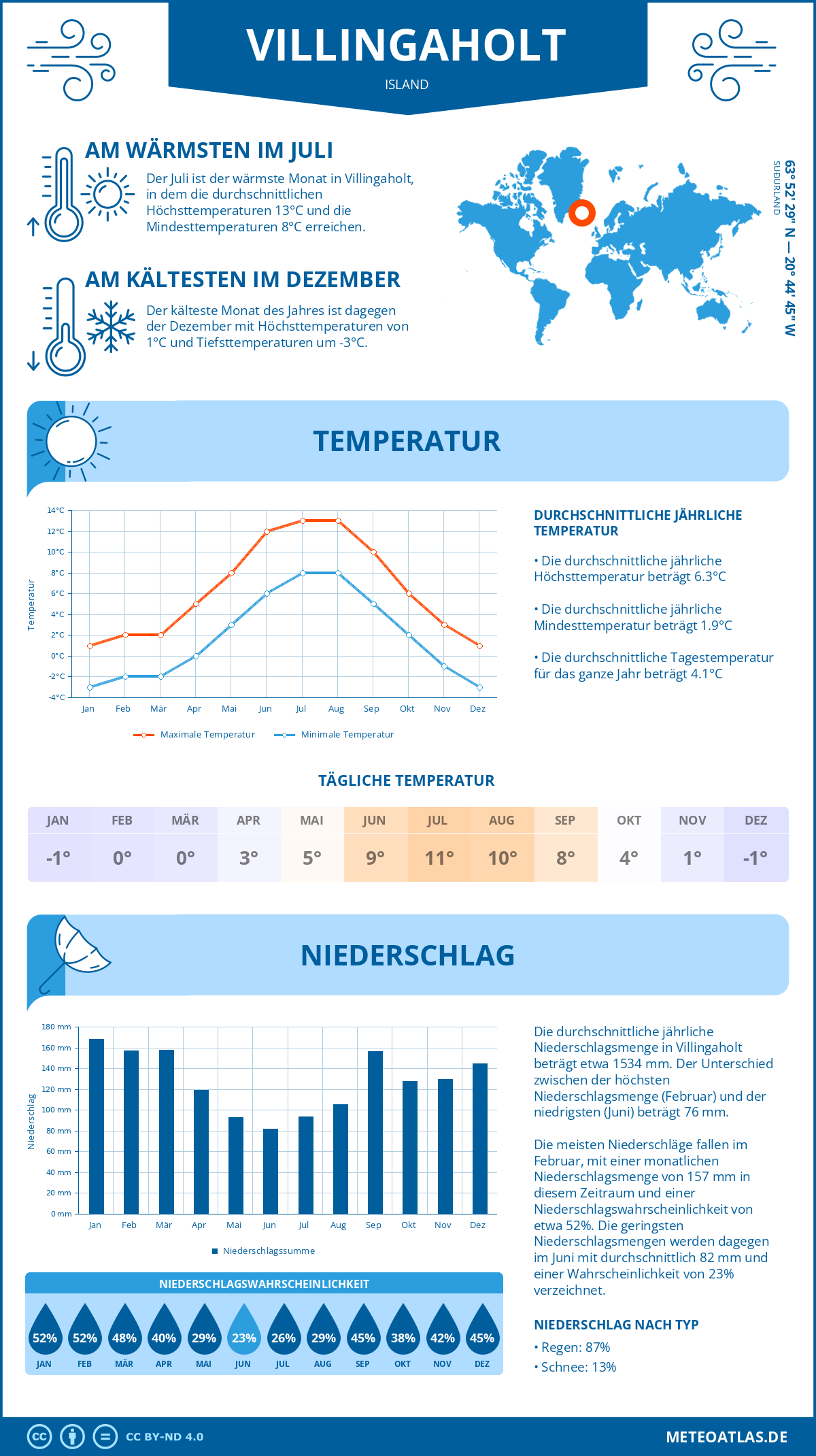 Villingaholt weist eine durchschnittliche Tagestemperatur von 6°C im Jahresmittel auf, während die nächtliche Temperatur auf etwa 2°C. Die durchschnittliche Temperatur über den gesamten Tagesverlauf beträgt 4°C.