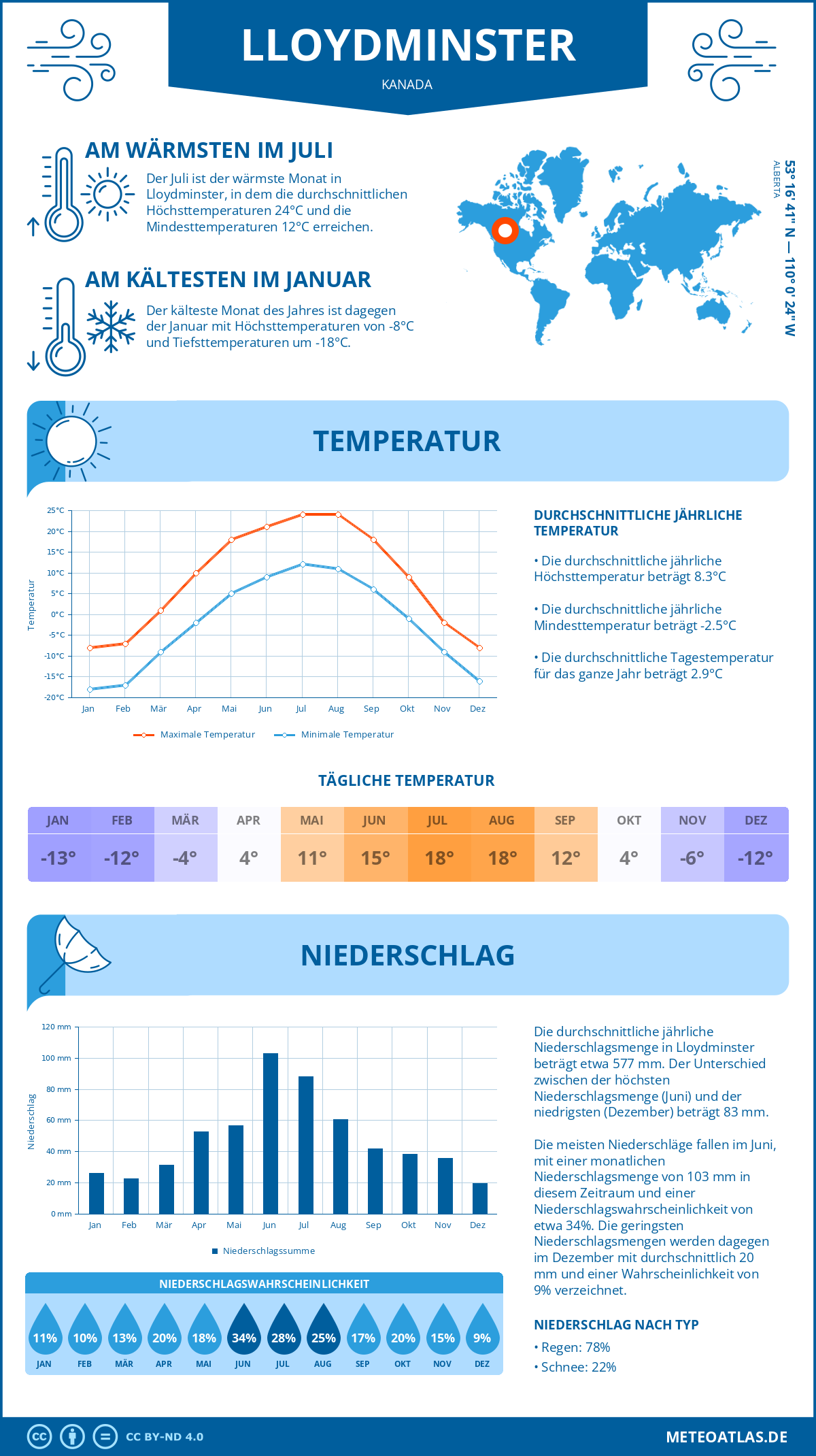 Lloydminster weist eine durchschnittliche Tagestemperatur von 8°C im Jahresmittel auf, während die nächtliche Temperatur auf etwa -3°C. Die durchschnittliche Temperatur über den gesamten Tagesverlauf beträgt 3°C.