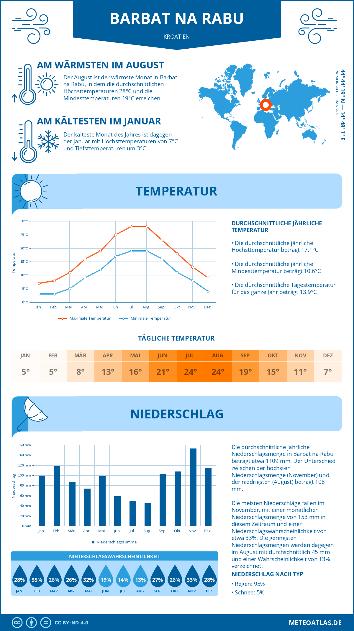 Der wärmste Zeitraum in Barbat na Rabu umfasst unter anderem den Juli und August, mit durchschnittlichen Tagestemperaturen von 28°C und Nachttemperaturen von 19°C. Im Gegensatz dazu gehört der Januar und Februar zum kältesten Zeitraum des Jahres, mit Tagestemperaturen von 8°C und Nachttemperaturen um 3°C.