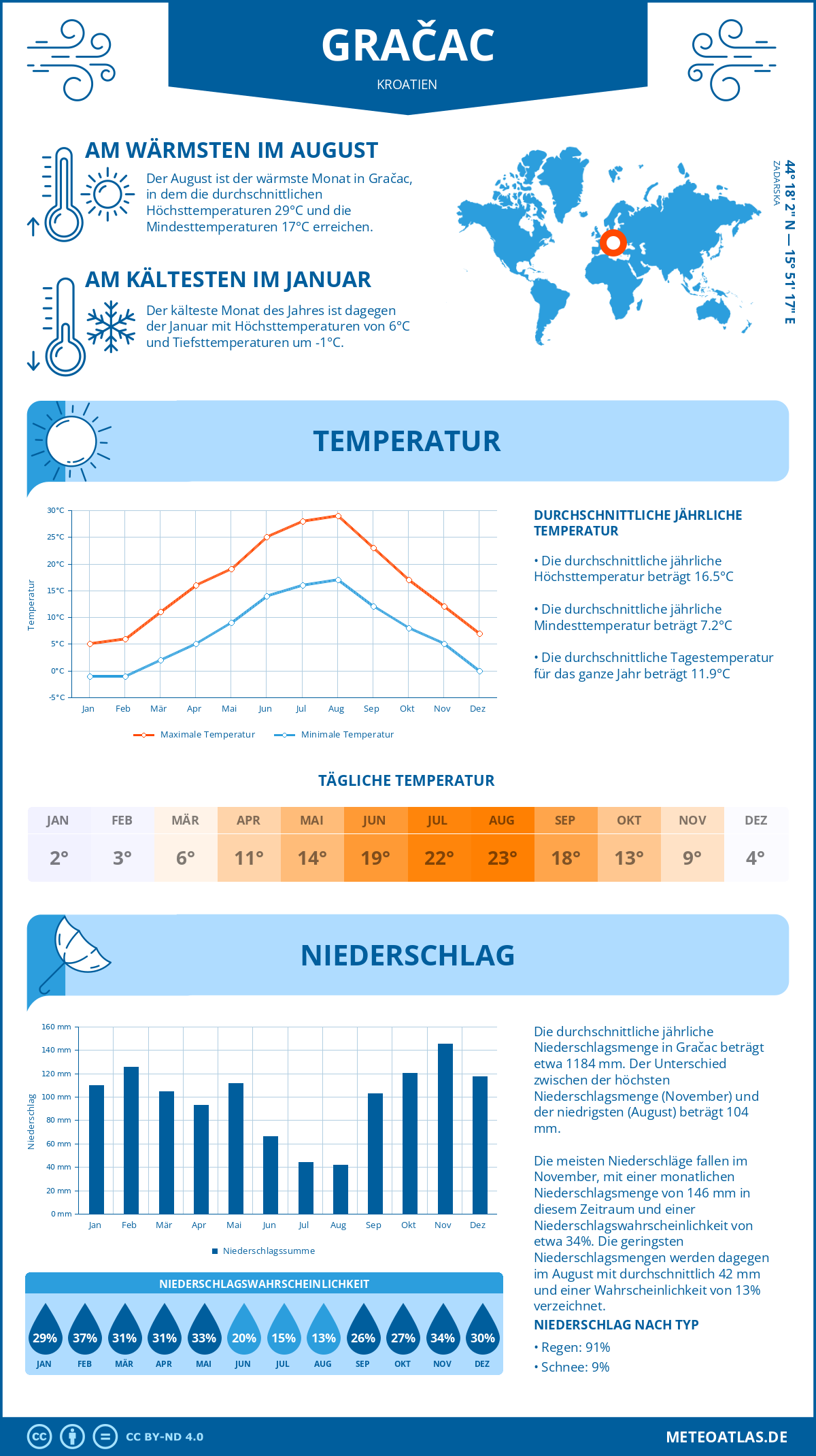 Gračac weist eine durchschnittliche Tagestemperatur von 17°C im Jahresmittel auf, während die nächtliche Temperatur auf etwa 7°C. Die durchschnittliche Temperatur über den gesamten Tagesverlauf beträgt 12°C.
