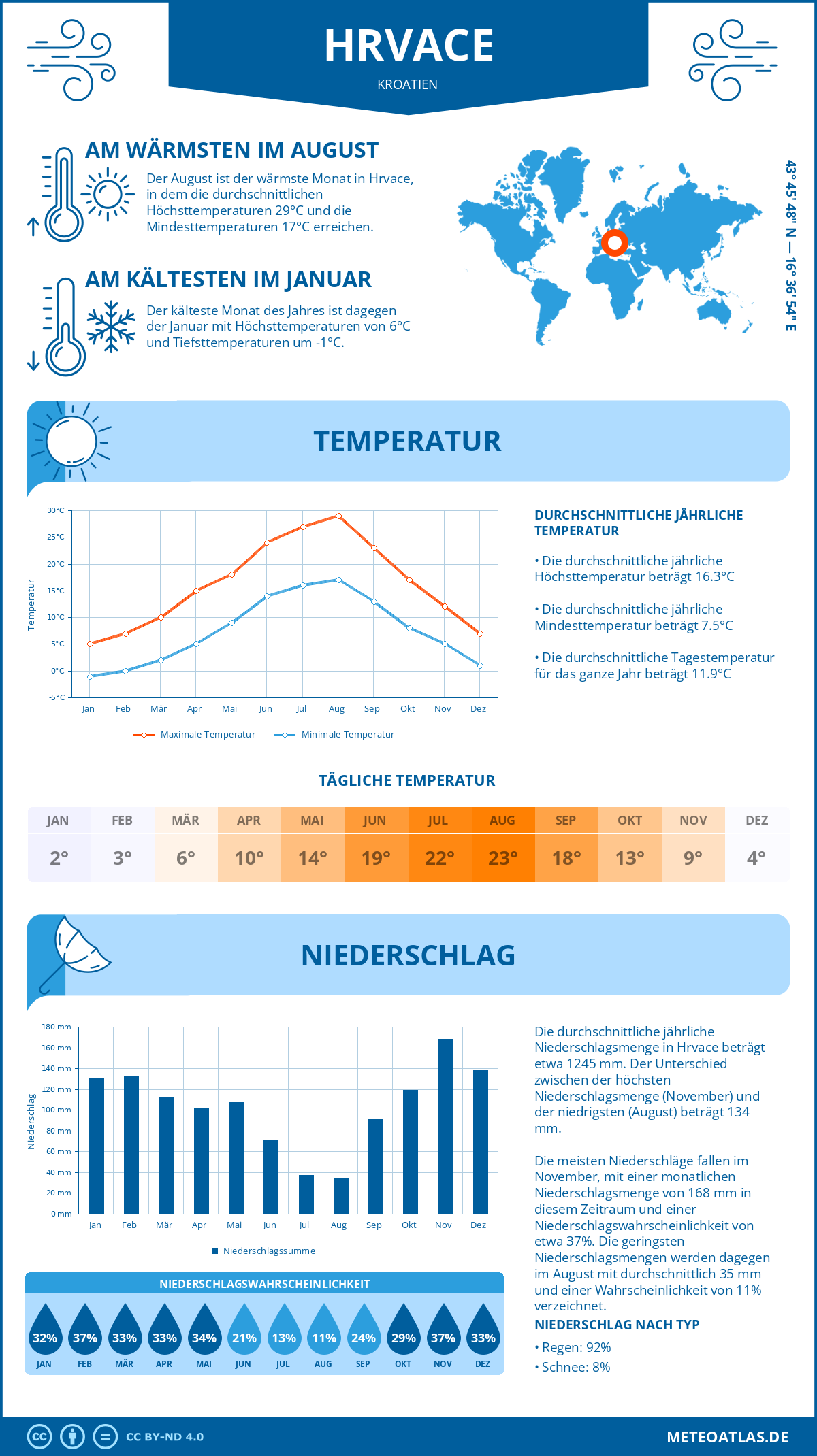Hrvace weist eine durchschnittliche Tagestemperatur von 16°C im Jahresmittel auf, während die nächtliche Temperatur auf etwa 7°C. Die durchschnittliche Temperatur über den gesamten Tagesverlauf beträgt 12°C.