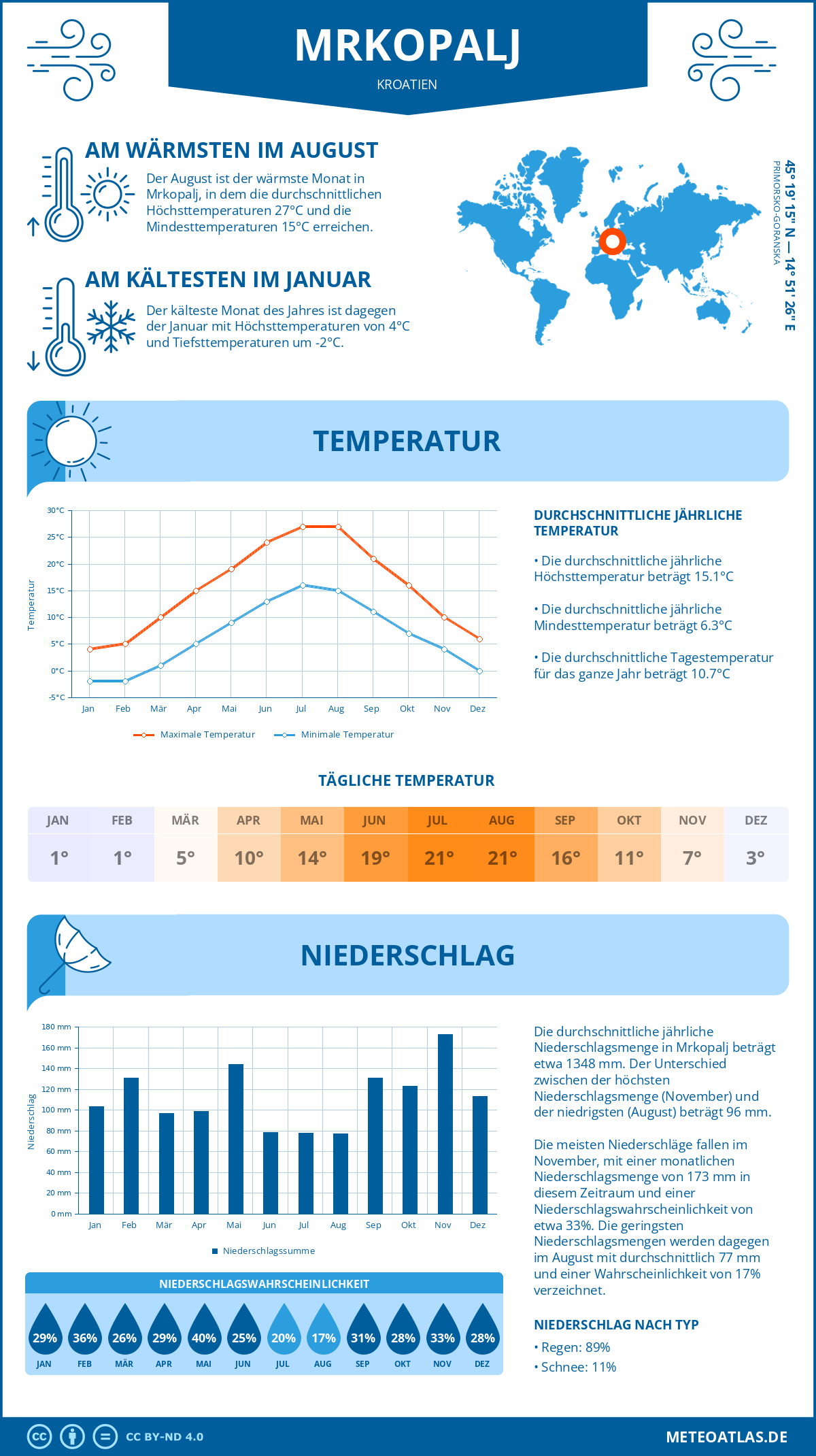 Mrkopalj weist eine durchschnittliche Tagestemperatur von 15°C im Jahresmittel auf, während die nächtliche Temperatur auf etwa 6°C. Die durchschnittliche Temperatur über den gesamten Tagesverlauf beträgt 11°C.