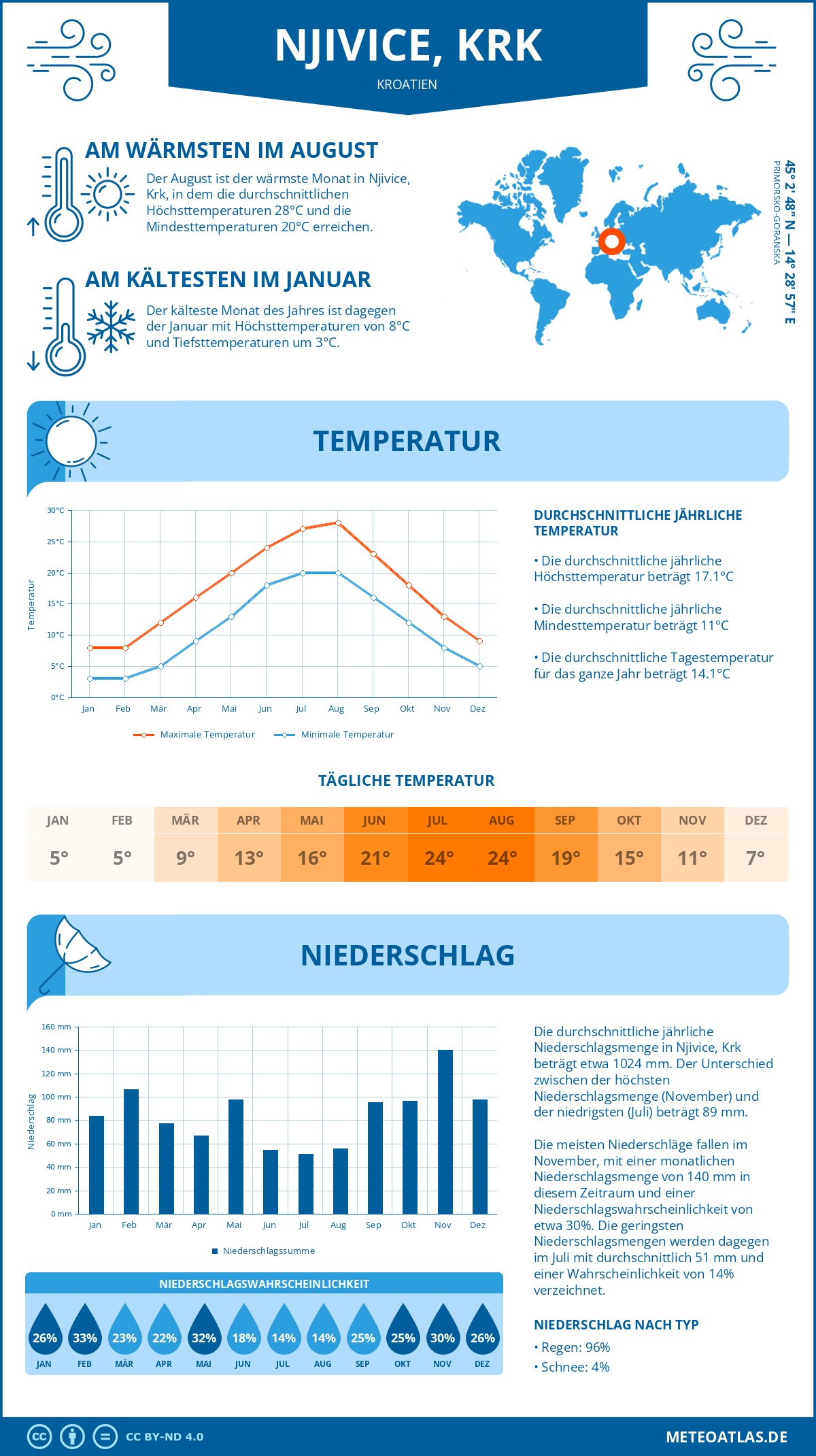 Infografik: Klima sowie monatliche Durchschnittstemperaturen und Niederschläge
