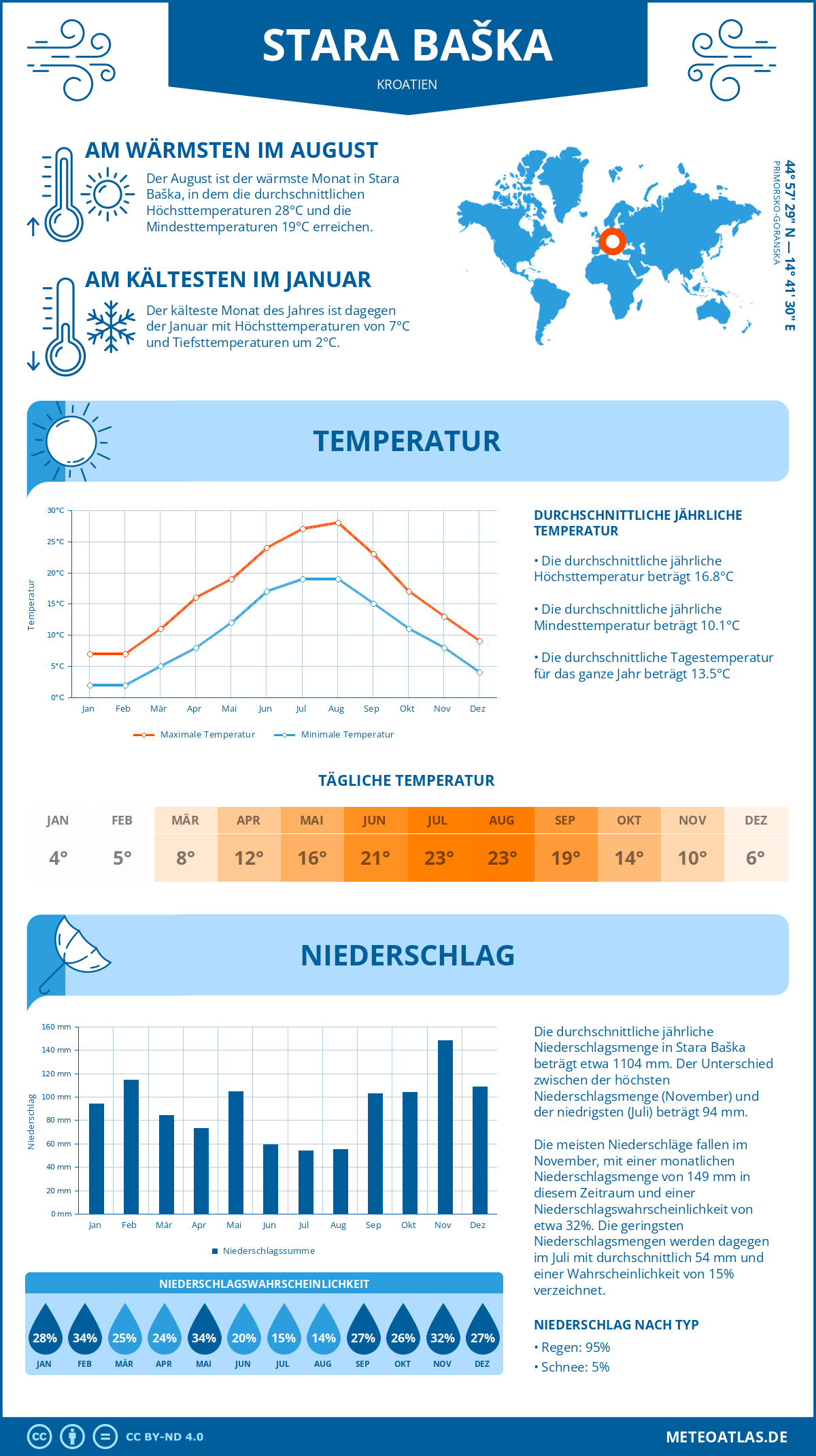 Stara Baška weist eine durchschnittliche Tagestemperatur von 17°C im Jahresmittel auf, während die nächtliche Temperatur auf etwa 10°C. Die durchschnittliche Temperatur über den gesamten Tagesverlauf beträgt 13°C.