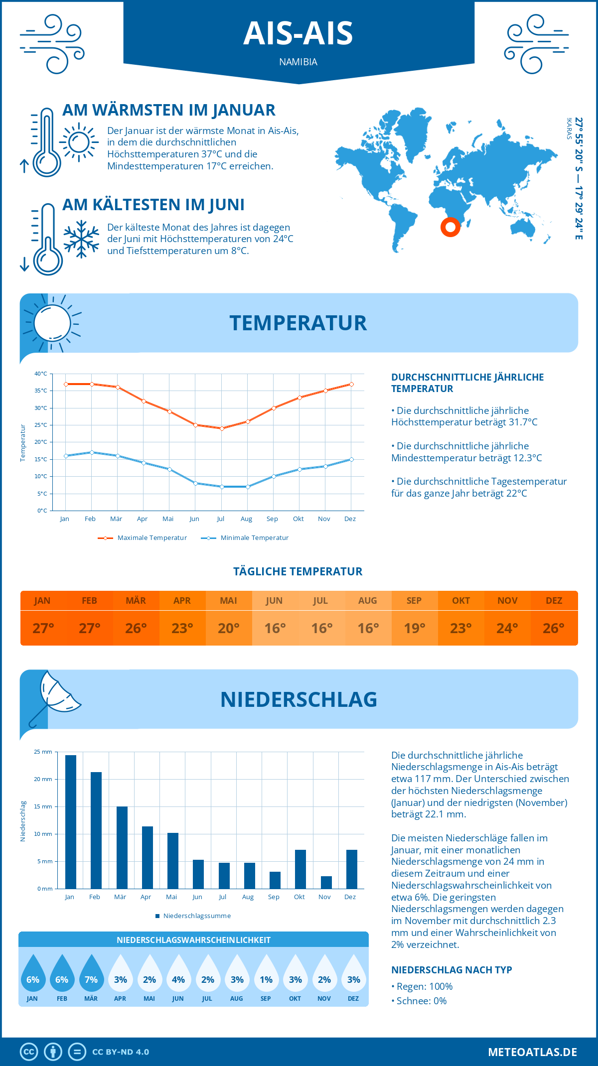 Ais-Ais weist eine durchschnittliche Tagestemperatur von 32°C im Jahresmittel auf, während die nächtliche Temperatur auf etwa 12°C. Die durchschnittliche Temperatur über den gesamten Tagesverlauf beträgt 22°C.