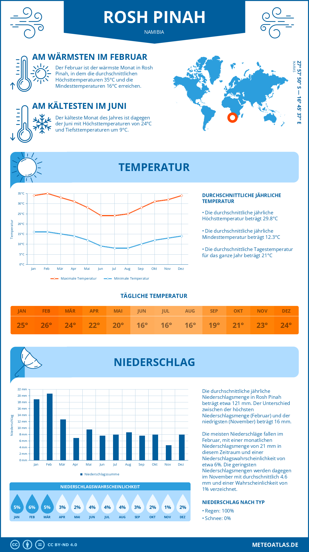 Rosh Pinah (Namibia) - Wetter und Klima im Jahresverlauf: Durchschnittswerte für Temperatur und Niederschlag