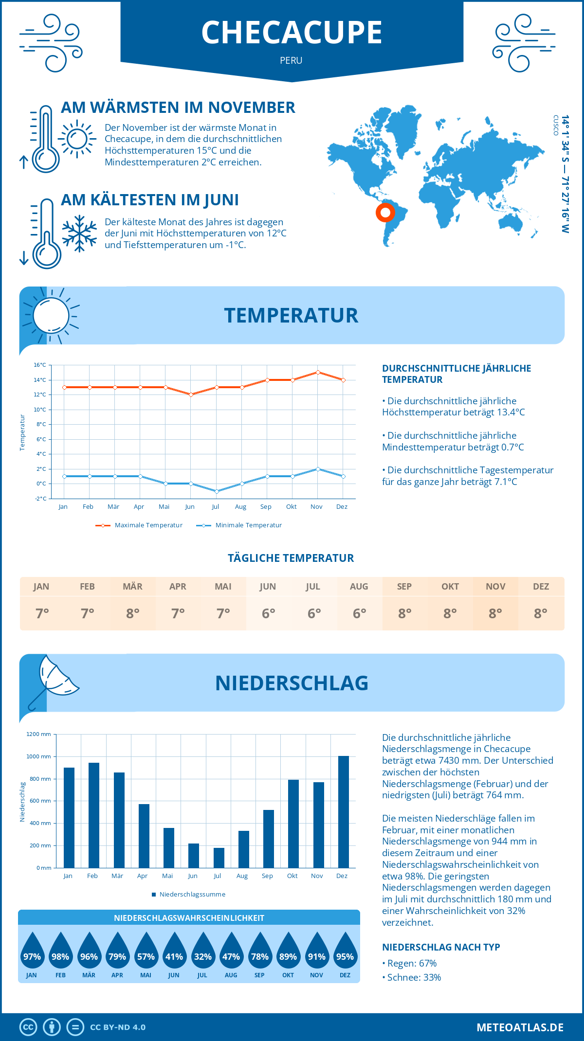 Checacupe weist eine durchschnittliche Tagestemperatur von 13°C im Jahresmittel auf, während die nächtliche Temperatur auf etwa 1°C. Die durchschnittliche Temperatur über den gesamten Tagesverlauf beträgt 7°C.