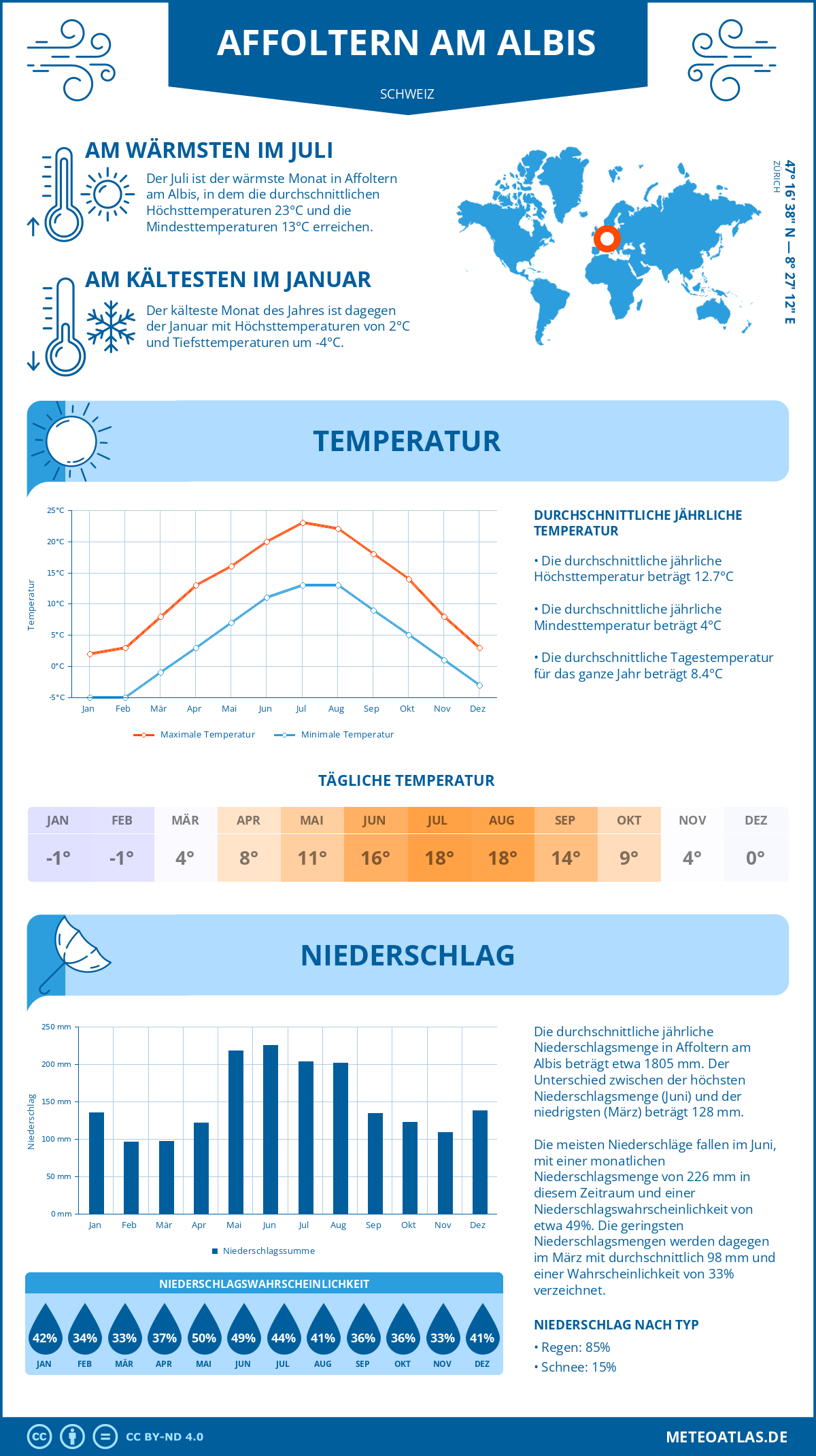 Affoltern am Albis (Schweiz) - Wetter und Klima im Jahresverlauf: Durchschnittswerte für Temperatur und Niederschlag