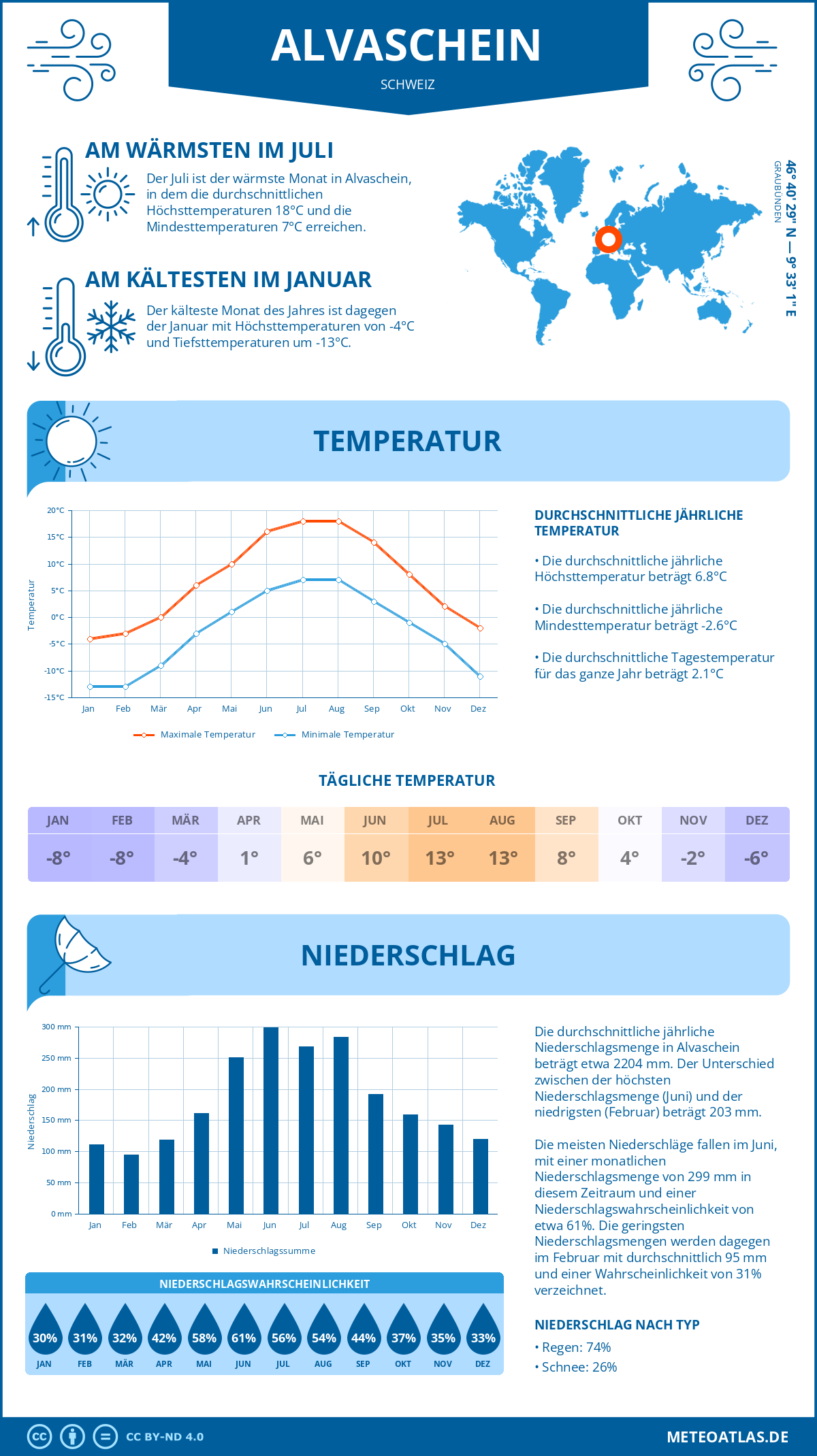 Alvaschein (Schweiz) - Wetter und Klima im Jahresverlauf: Durchschnittswerte für Temperatur und Niederschlag