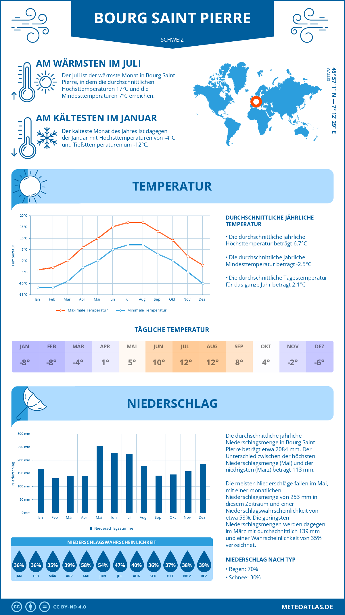 Bourg Saint Pierre (Schweiz) - Wetter und Klima im Jahresverlauf: Durchschnittswerte für Temperatur und Niederschlag
