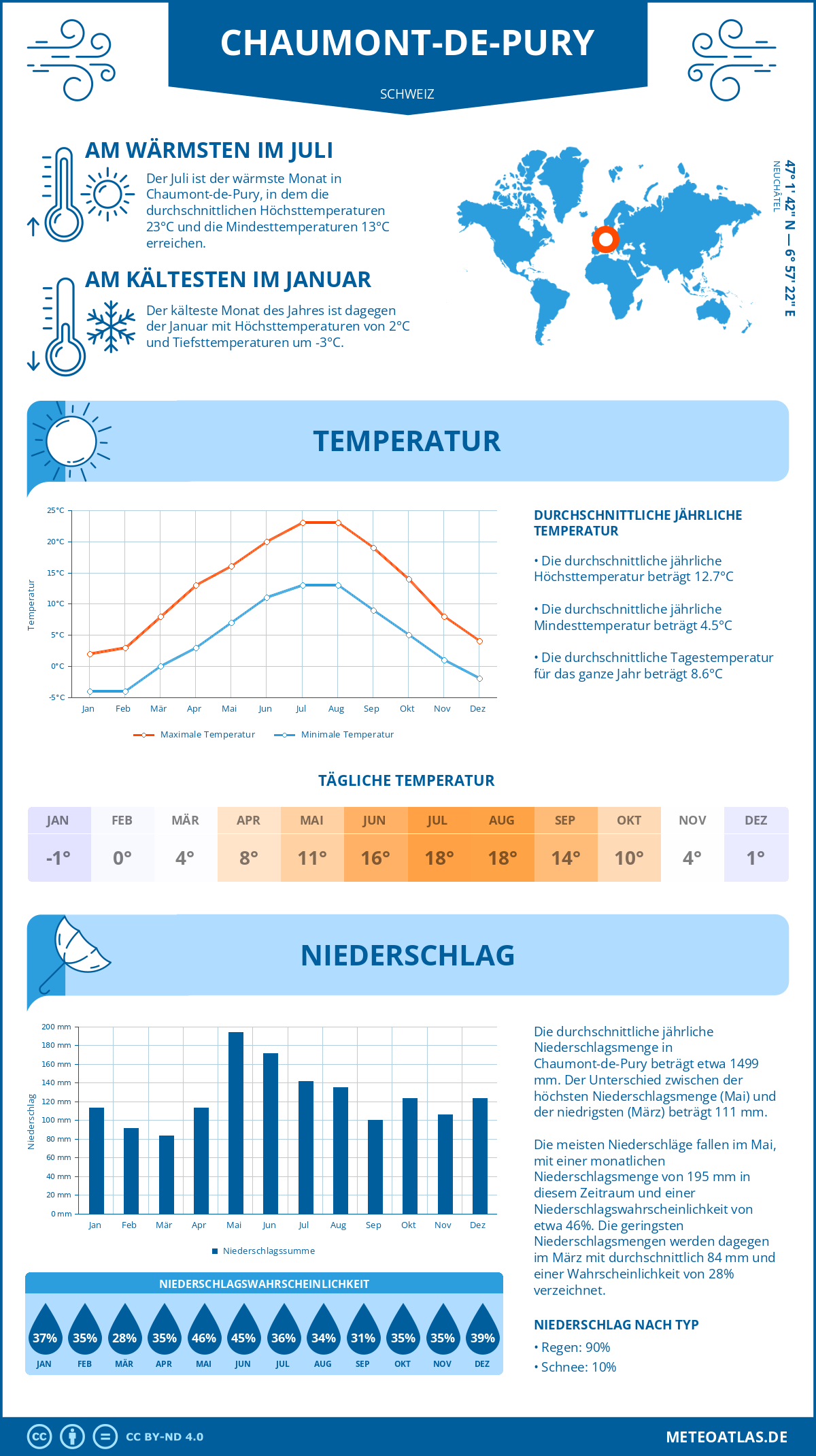Chaumont-de-Pury (Schweiz) - Wetter und Klima im Jahresverlauf: Durchschnittswerte für Temperatur und Niederschlag
