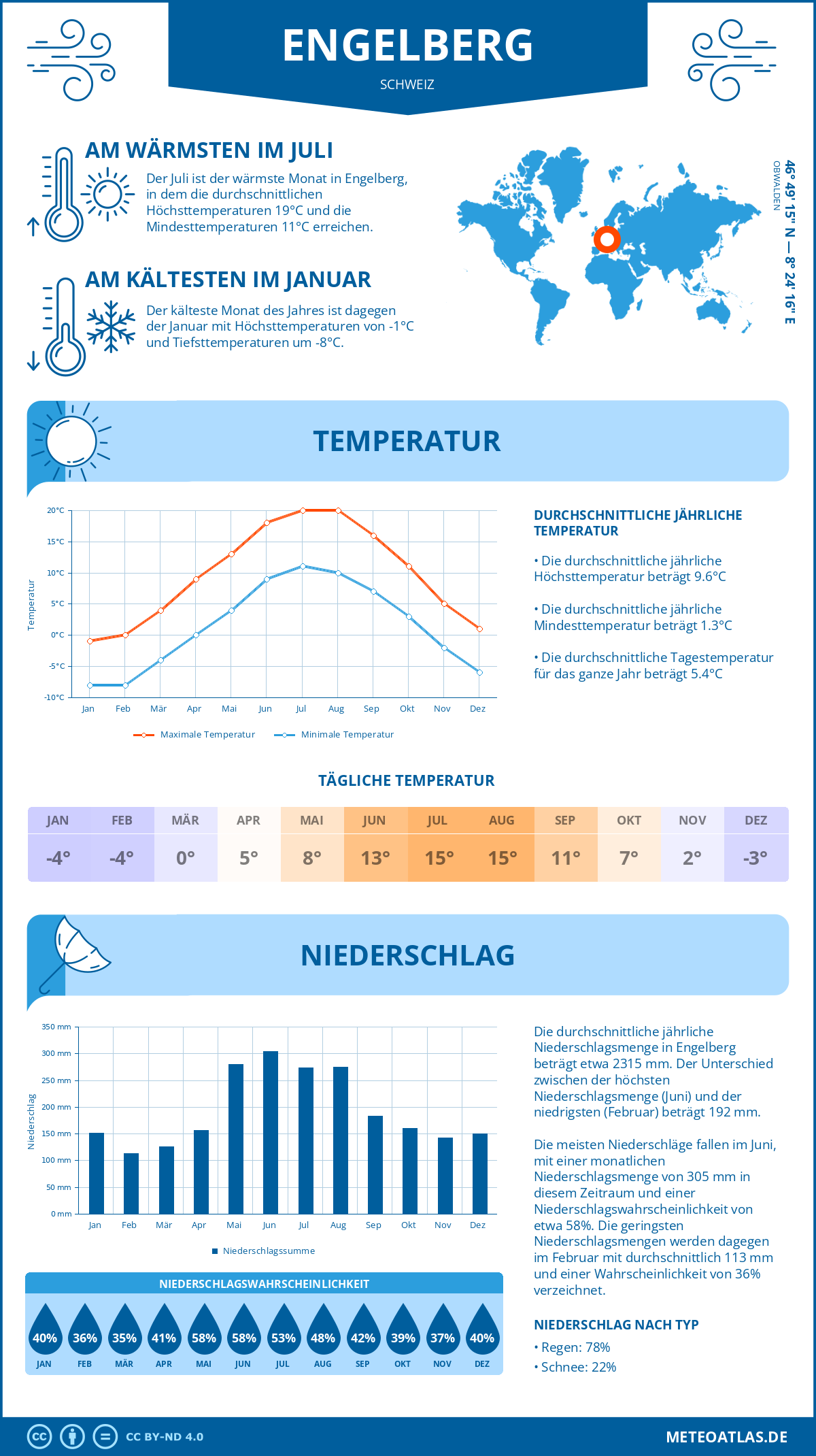 Engelberg (Schweiz) - Wetter und Klima im Jahresverlauf: Durchschnittswerte für Temperatur und Niederschlag