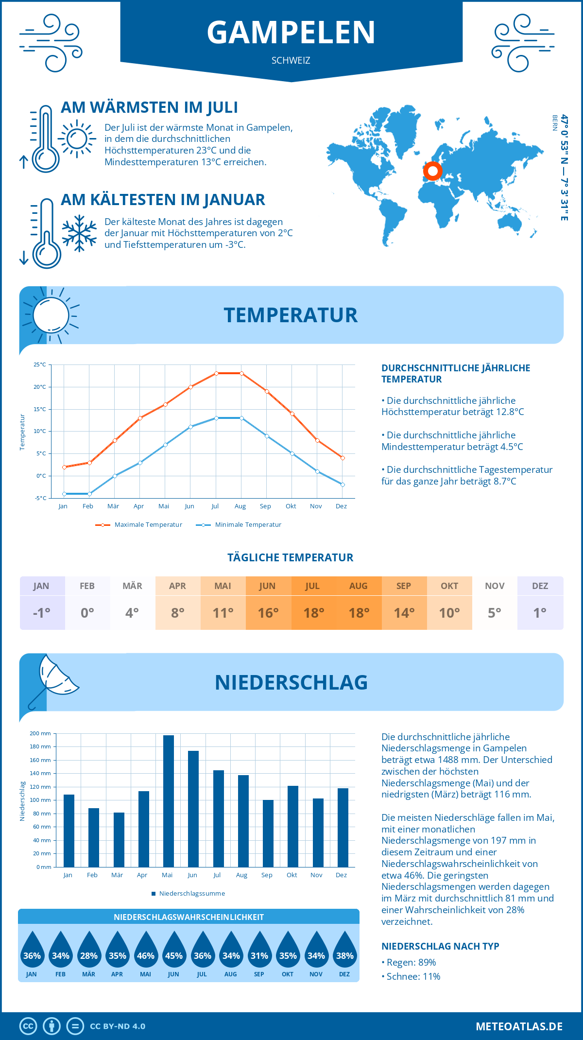 Gampelen weist eine durchschnittliche Tagestemperatur von 13°C im Jahresmittel auf, während die nächtliche Temperatur auf etwa 5°C. Die durchschnittliche Temperatur über den gesamten Tagesverlauf beträgt 9°C.