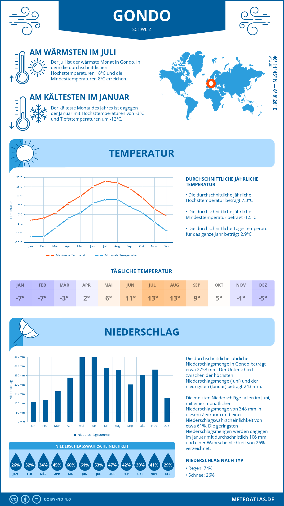 Gondo weist eine durchschnittliche Tagestemperatur von 7°C im Jahresmittel auf, während die nächtliche Temperatur auf etwa -1°C. Die durchschnittliche Temperatur über den gesamten Tagesverlauf beträgt 3°C.