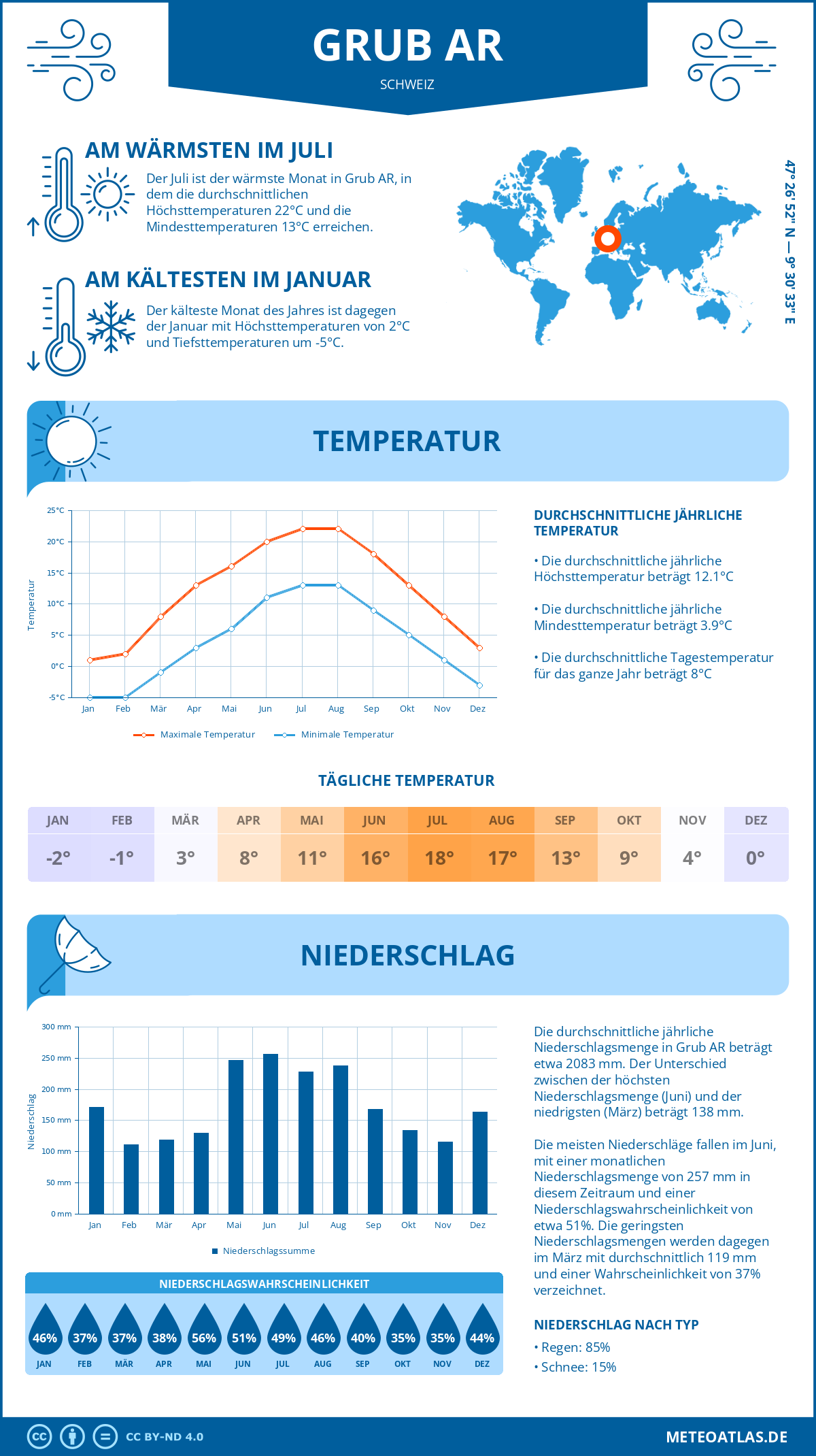Grub AR (Schweiz) - Wetter und Klima im Jahresverlauf: Durchschnittswerte für Temperatur und Niederschlag