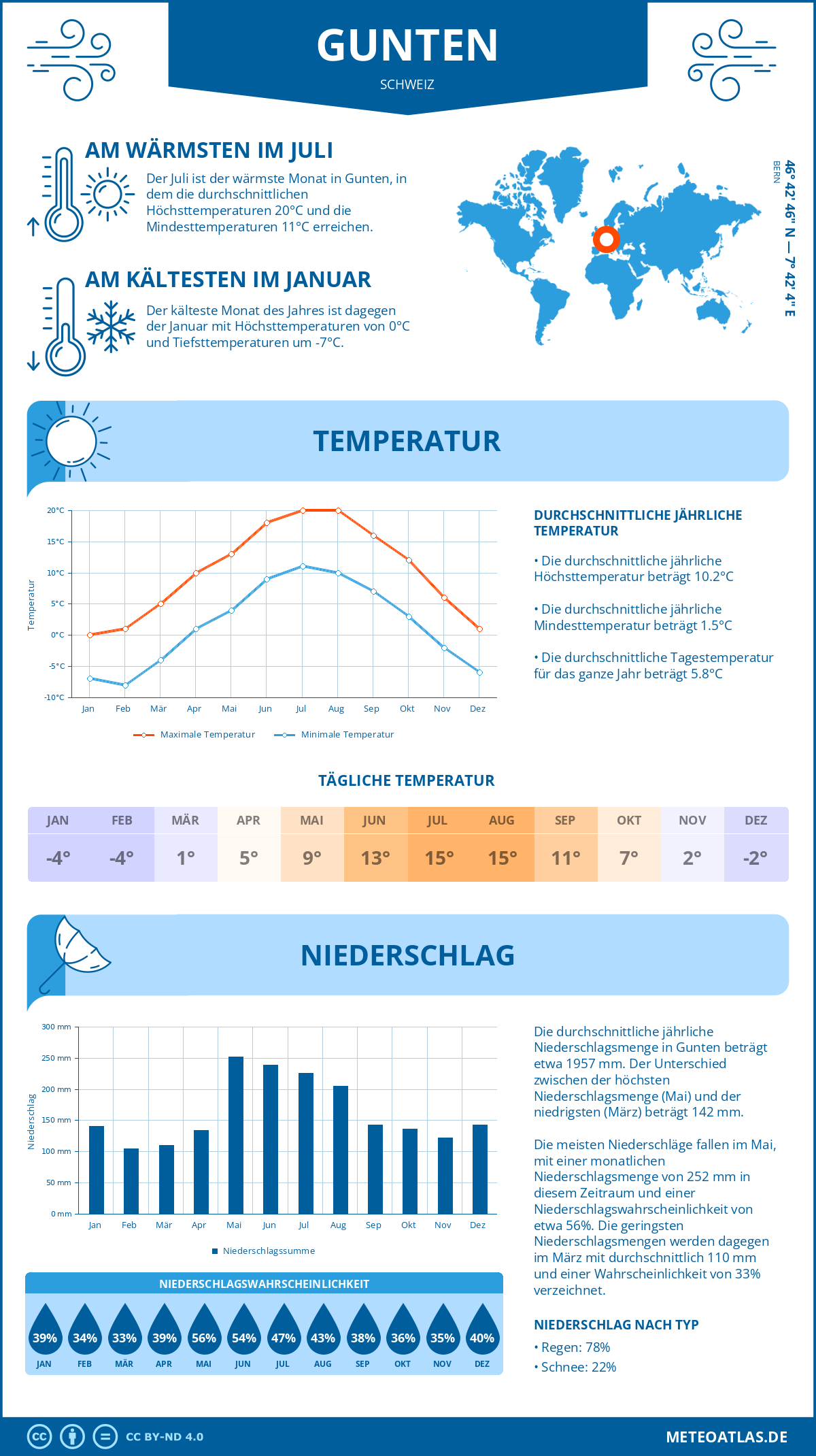 Gunten weist eine durchschnittliche Tagestemperatur von 10°C im Jahresmittel auf, während die nächtliche Temperatur auf etwa 1°C. Die durchschnittliche Temperatur über den gesamten Tagesverlauf beträgt 6°C.