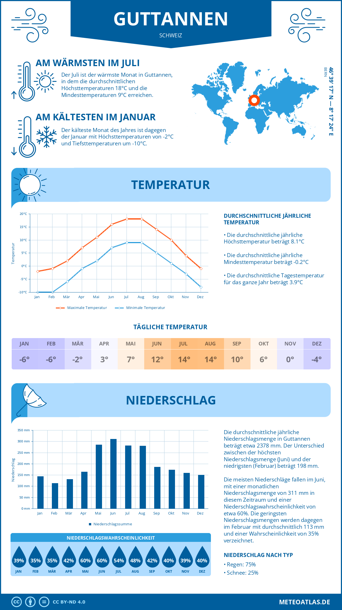 Guttannen (Schweiz) - Wetter und Klima im Jahresverlauf: Durchschnittswerte für Temperatur und Niederschlag