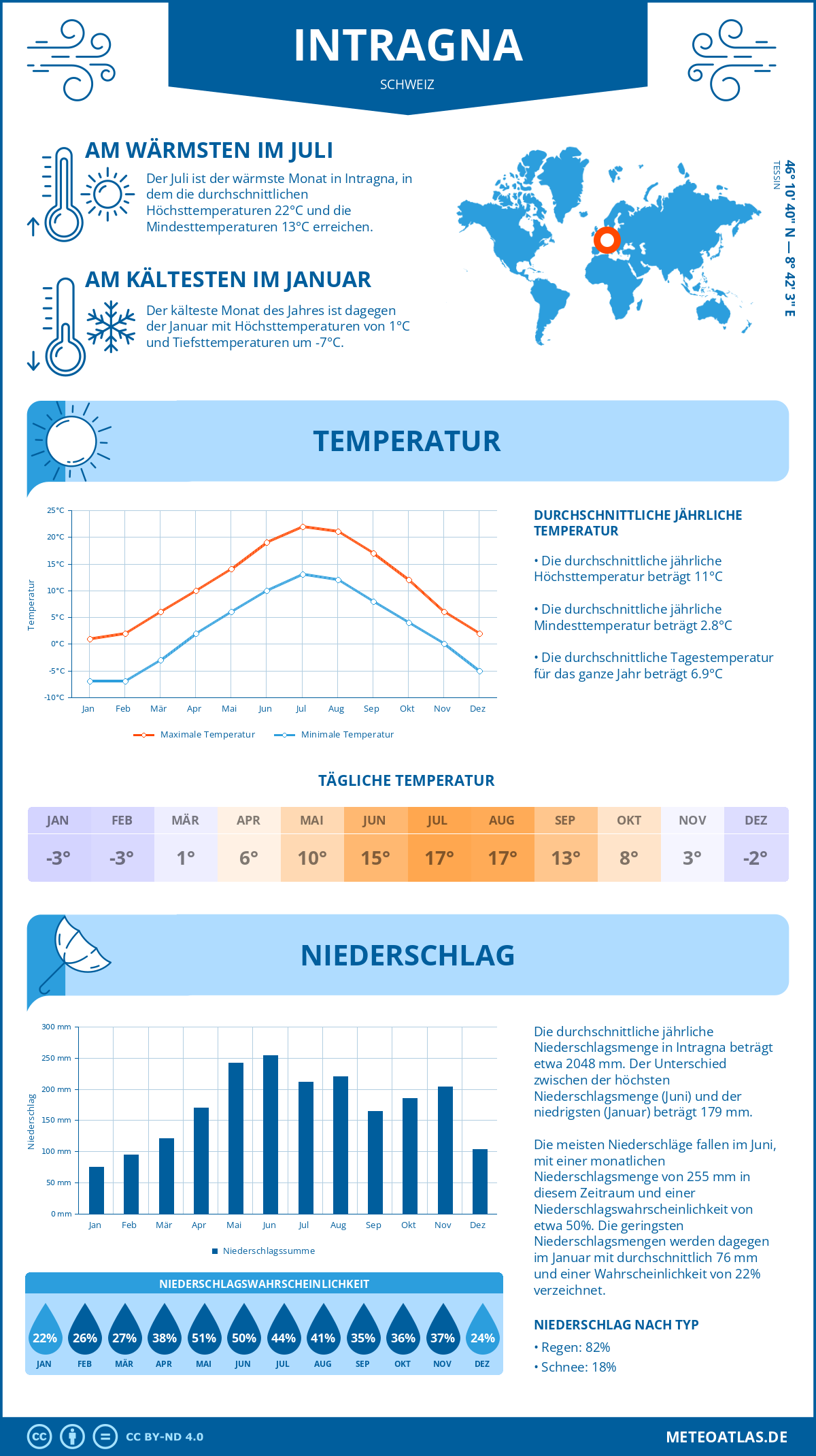 Intragna (Schweiz) - Wetter und Klima im Jahresverlauf: Durchschnittswerte für Temperatur und Niederschlag