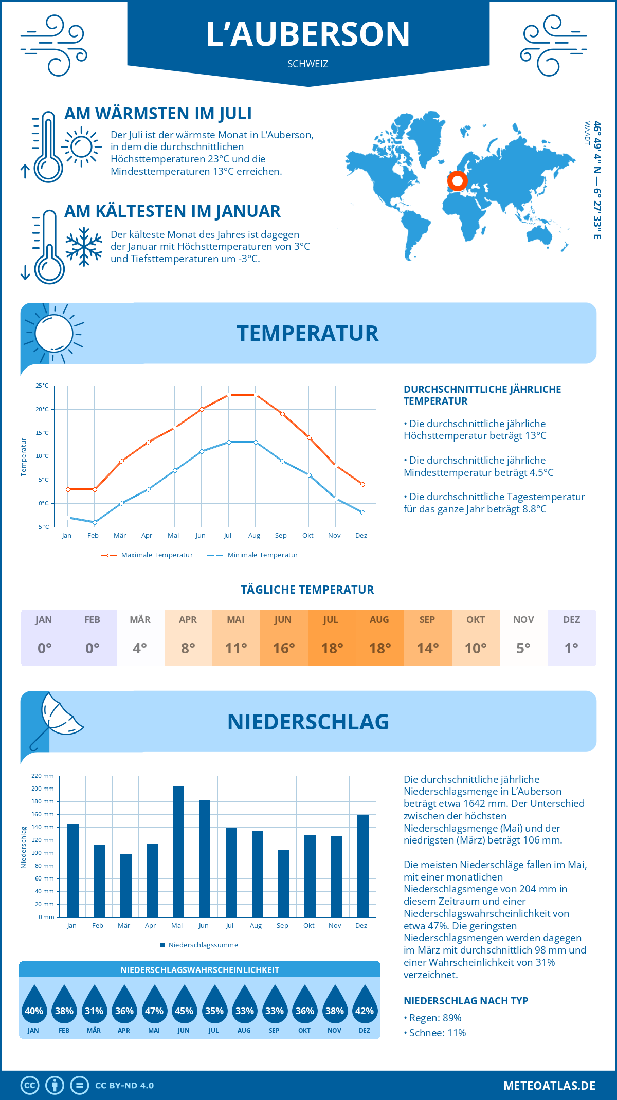 L’Auberson weist eine durchschnittliche Tagestemperatur von 13°C im Jahresmittel auf, während die nächtliche Temperatur auf etwa 5°C. Die durchschnittliche Temperatur über den gesamten Tagesverlauf beträgt 9°C.