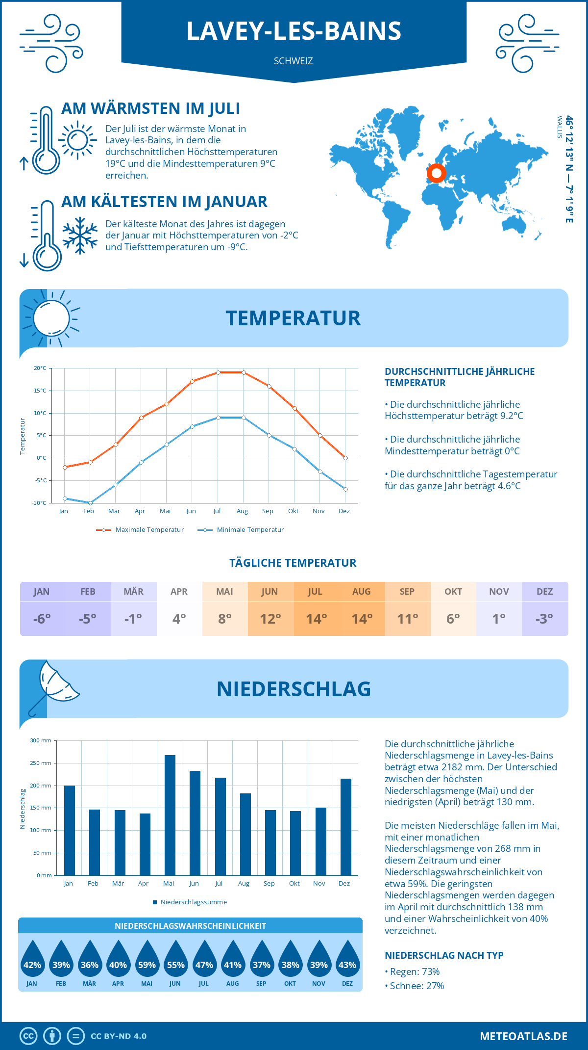 Lavey-les-Bains weist eine durchschnittliche Tagestemperatur von 9°C im Jahresmittel auf, während die nächtliche Temperatur auf etwa 0°C. Die durchschnittliche Temperatur über den gesamten Tagesverlauf beträgt 5°C.