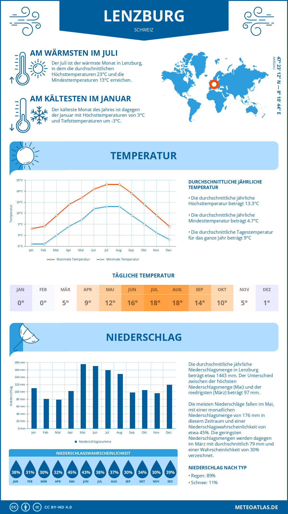 Lenzburg weist eine durchschnittliche Tagestemperatur von 13°C im Jahresmittel auf, während die nächtliche Temperatur auf etwa 5°C. Die durchschnittliche Temperatur über den gesamten Tagesverlauf beträgt 9°C.