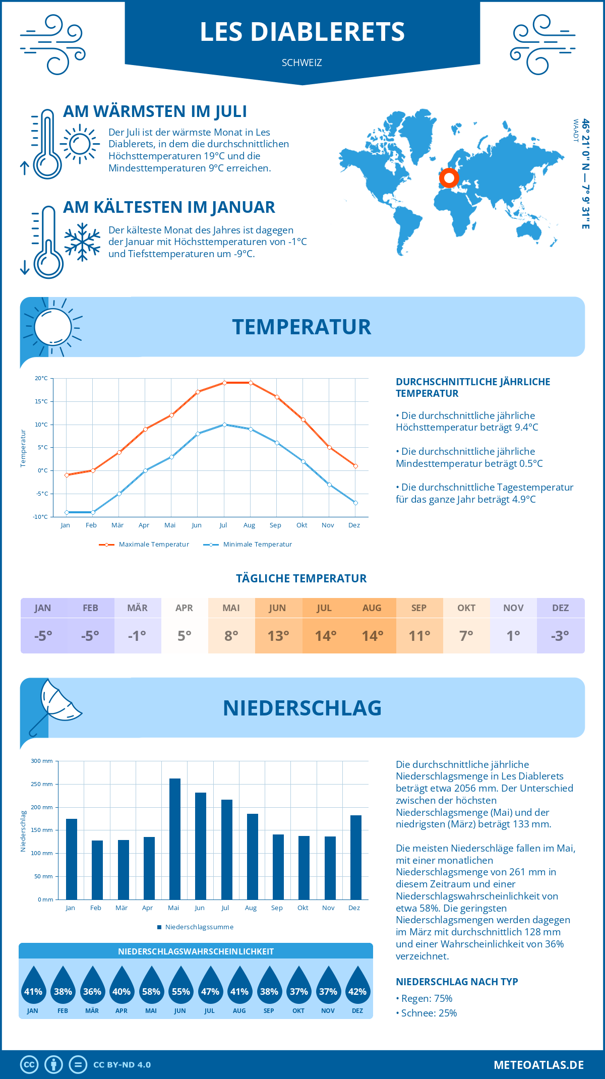 Les Diablerets weist eine durchschnittliche Tagestemperatur von 9°C im Jahresmittel auf, während die nächtliche Temperatur auf etwa 0°C. Die durchschnittliche Temperatur über den gesamten Tagesverlauf beträgt 5°C.