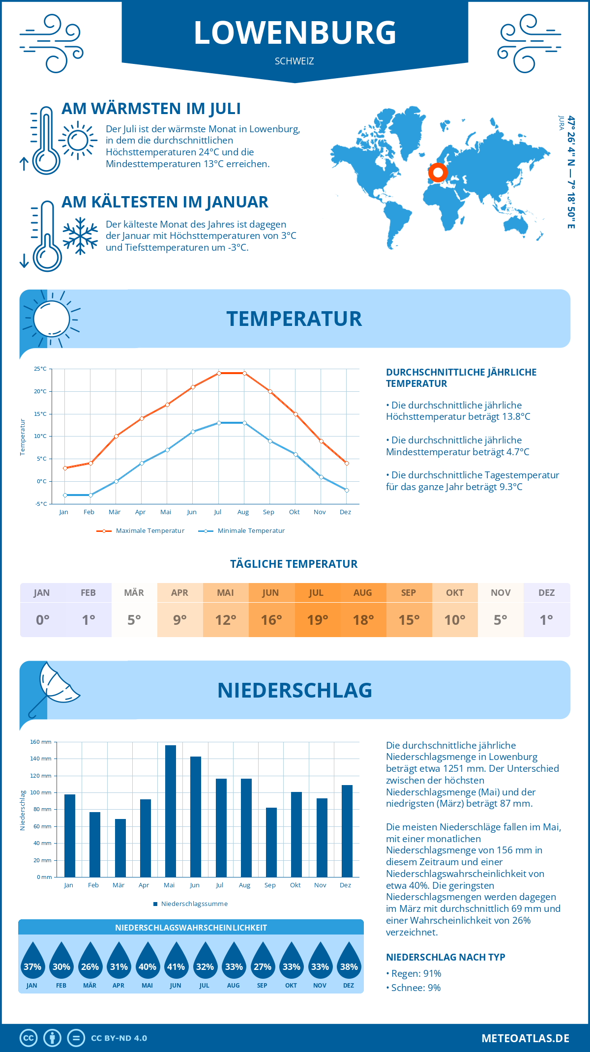 Lowenburg (Schweiz) - Wetter und Klima im Jahresverlauf: Durchschnittswerte für Temperatur und Niederschlag