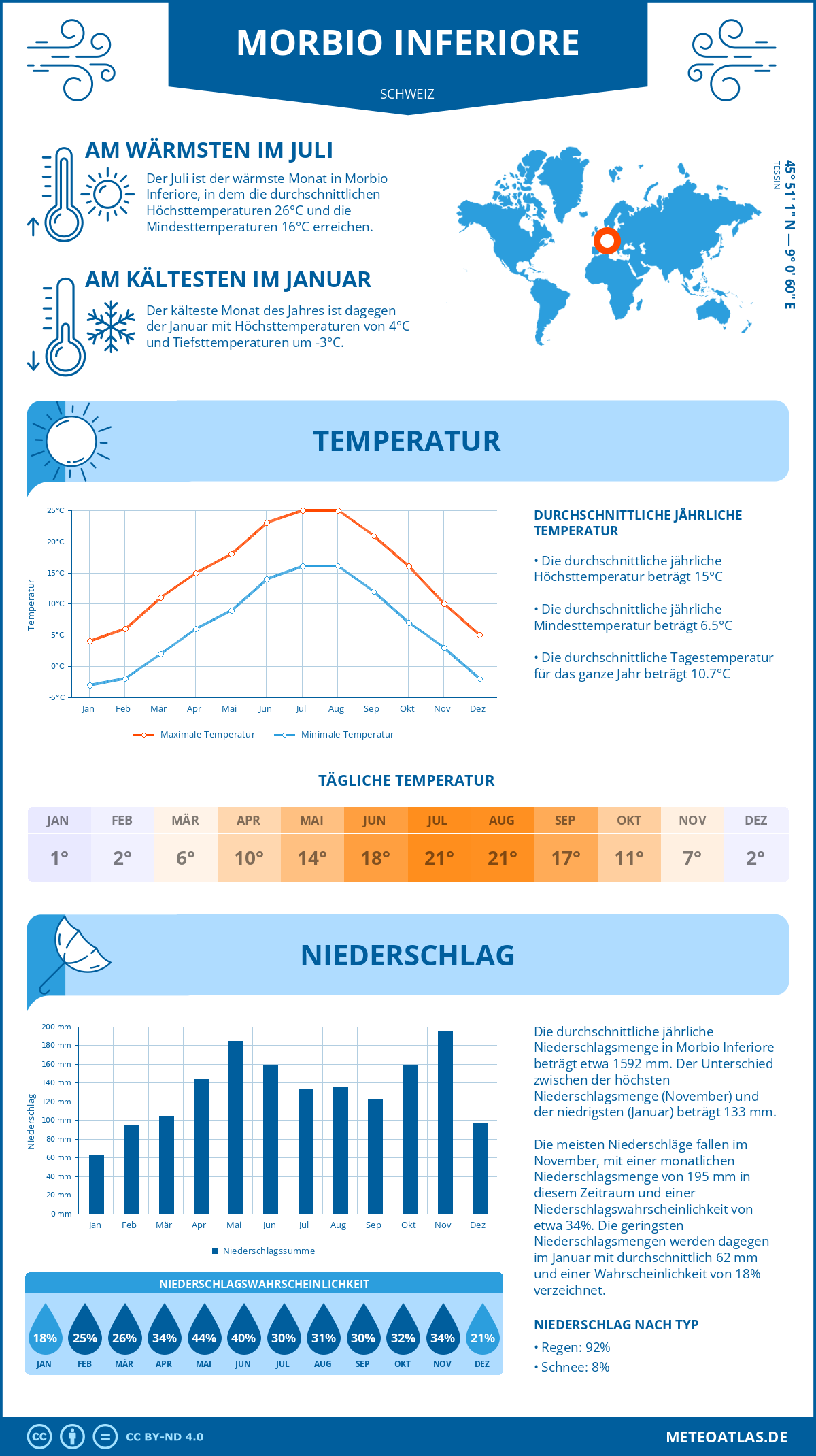 Morbio Inferiore weist eine durchschnittliche Tagestemperatur von 15°C im Jahresmittel auf, während die nächtliche Temperatur auf etwa 6°C. Die durchschnittliche Temperatur über den gesamten Tagesverlauf beträgt 11°C.