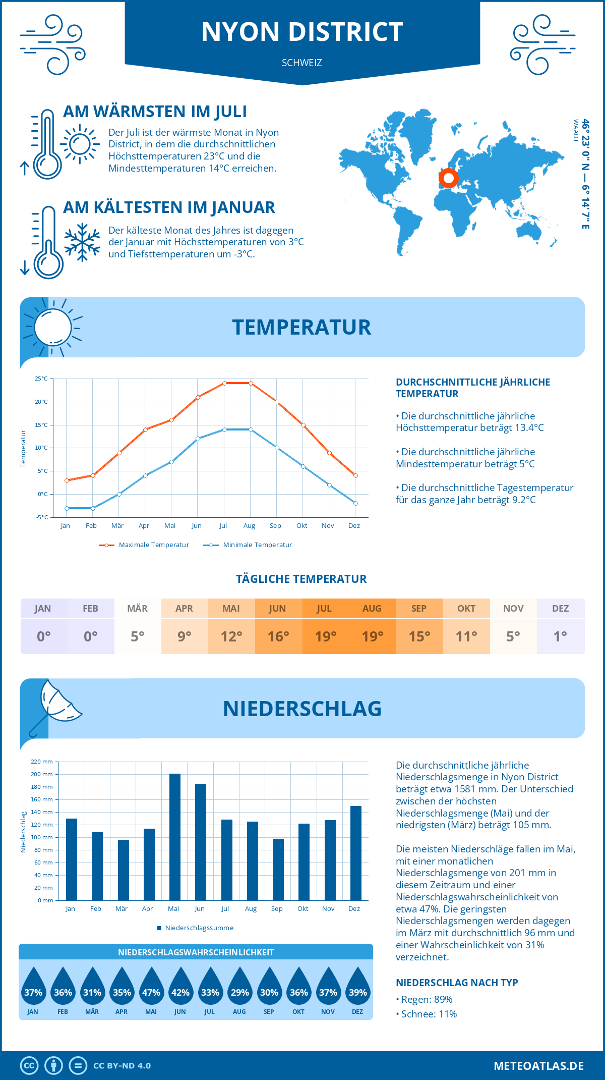 Nyon District (Schweiz) - Wetter und Klima im Jahresverlauf: Durchschnittswerte für Temperatur und Niederschlag