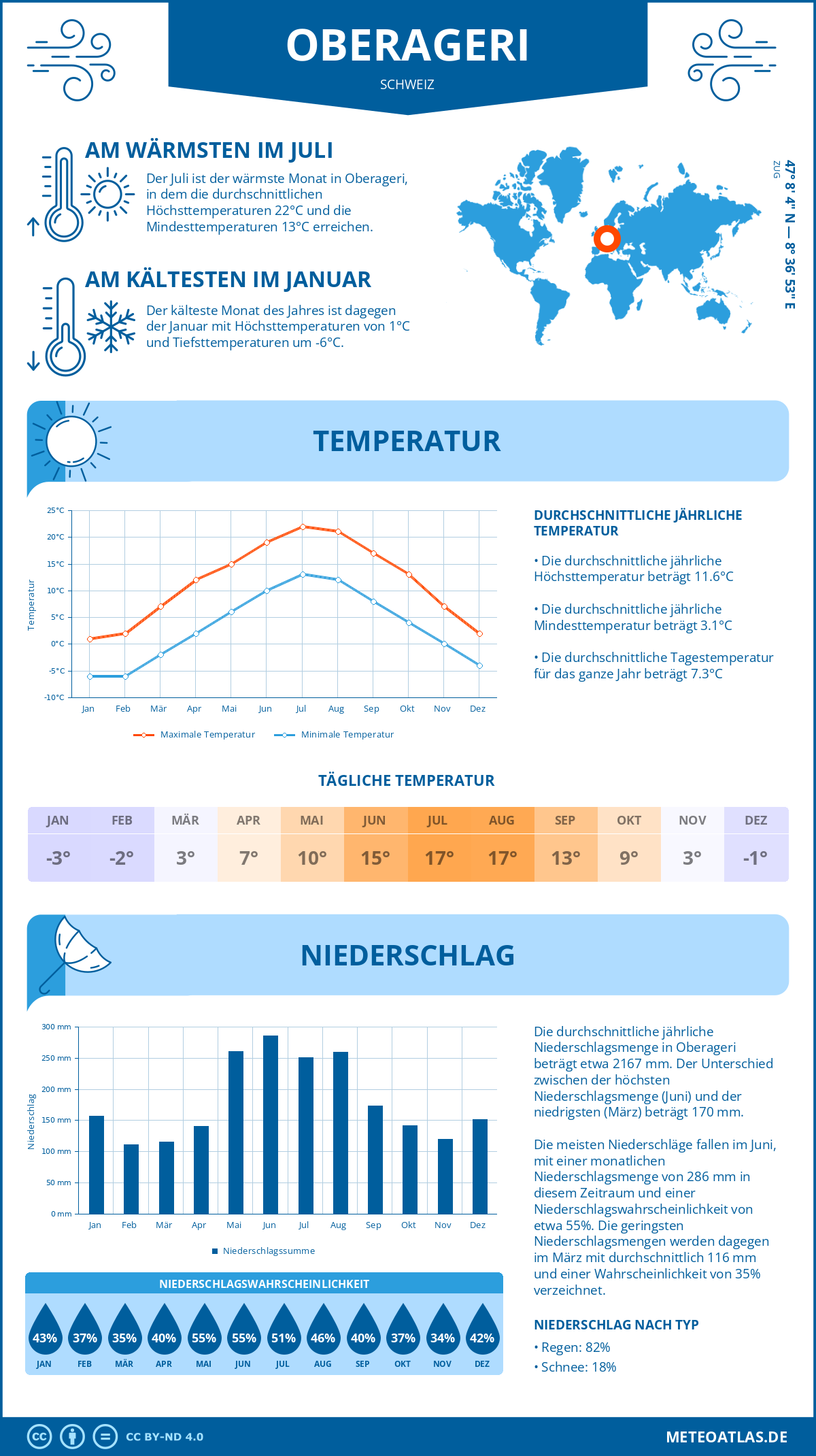 Oberageri (Schweiz) - Wetter und Klima im Jahresverlauf: Durchschnittswerte für Temperatur und Niederschlag