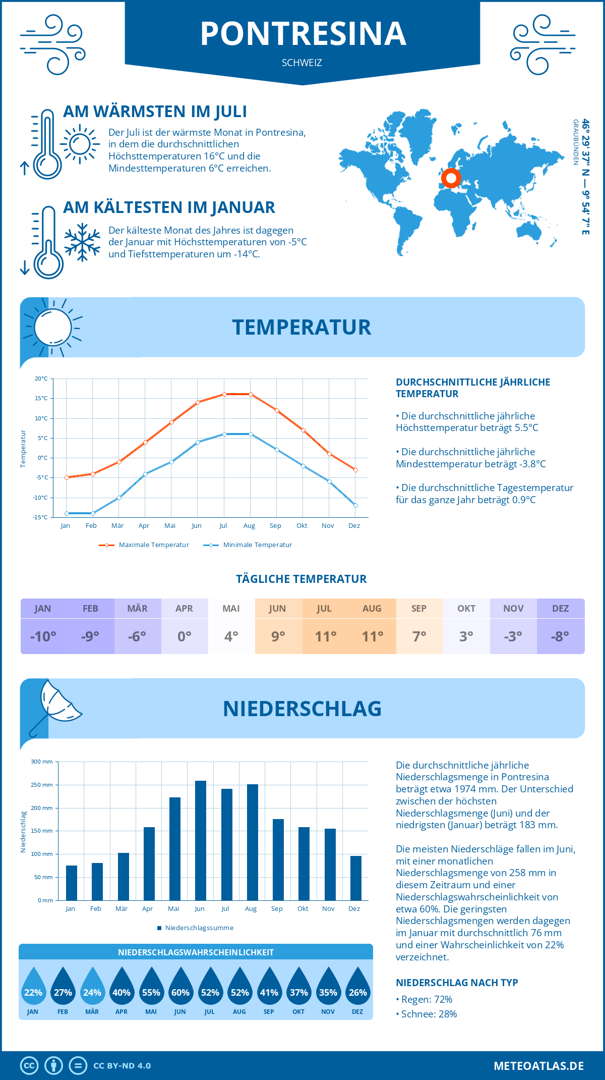Pontresina (Schweiz) - Wetter und Klima im Jahresverlauf: Durchschnittswerte für Temperatur und Niederschlag