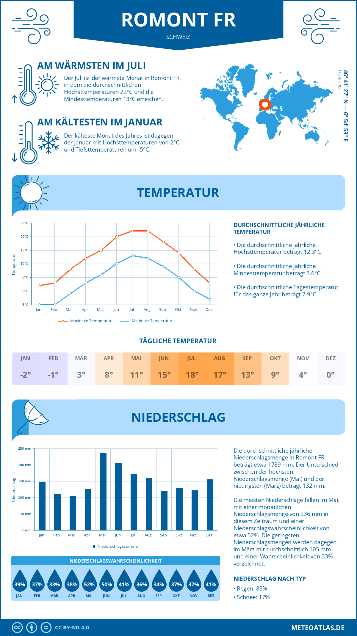 Daten über die jährliche Verteilung der Niederschläge in Romont FR zeigen, dass Regen mit einem Anteil von 83% zwar dominiert, aber Schnee, obwohl seltener, dennoch eine bedeutende Rolle spielt und 17% des Gesamtvolumens ausmacht.