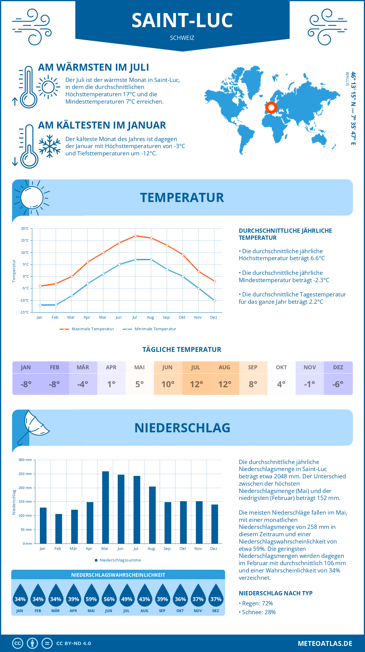 Saint-Luc (Schweiz) - Wetter und Klima im Jahresverlauf: Durchschnittswerte für Temperatur und Niederschlag