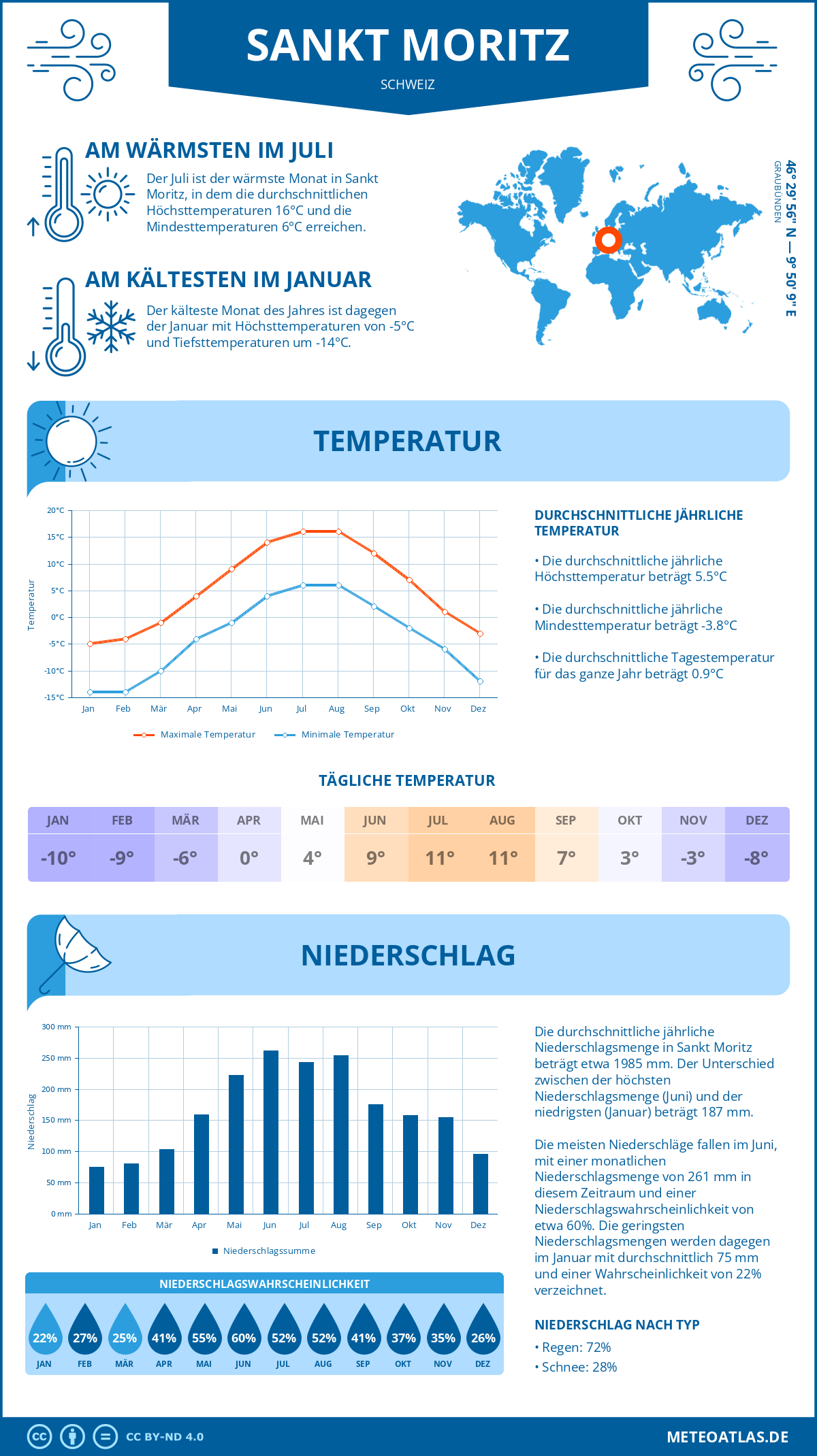 Sankt Moritz (Schweiz) - Wetter und Klima im Jahresverlauf: Durchschnittswerte für Temperatur und Niederschlag