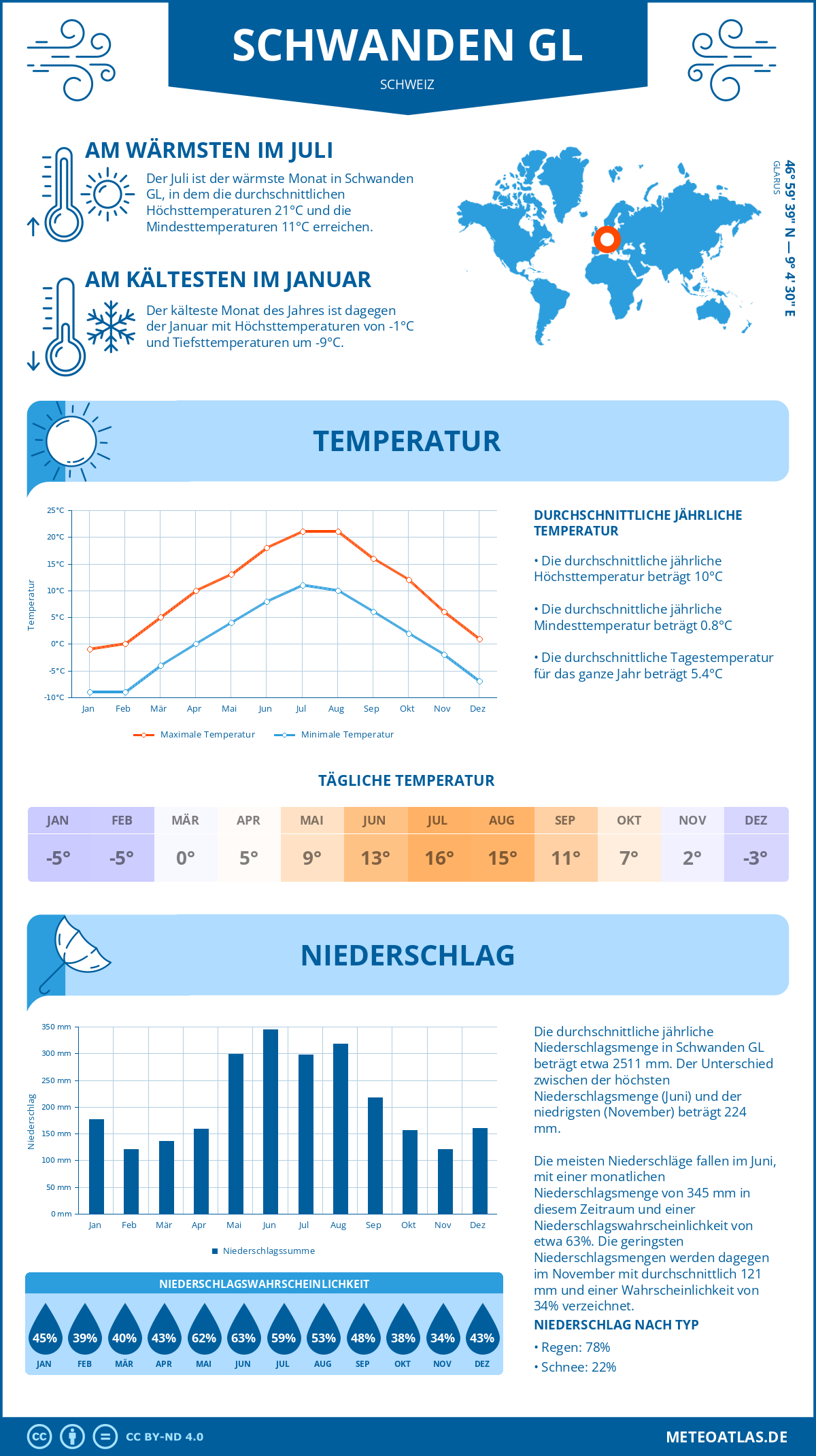 Schwanden GL (Schweiz) - Wetter und Klima im Jahresverlauf: Durchschnittswerte für Temperatur und Niederschlag