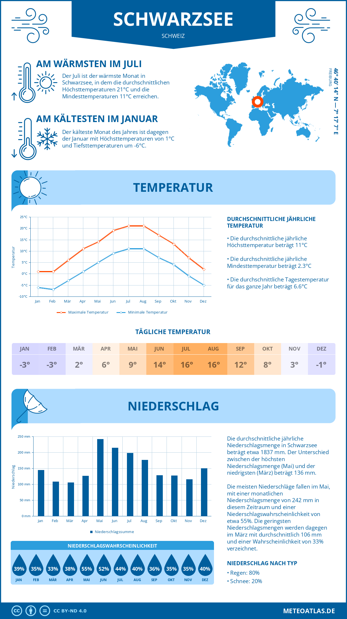 Schwarzsee (Schweiz) - Wetter und Klima im Jahresverlauf: Durchschnittswerte für Temperatur und Niederschlag
