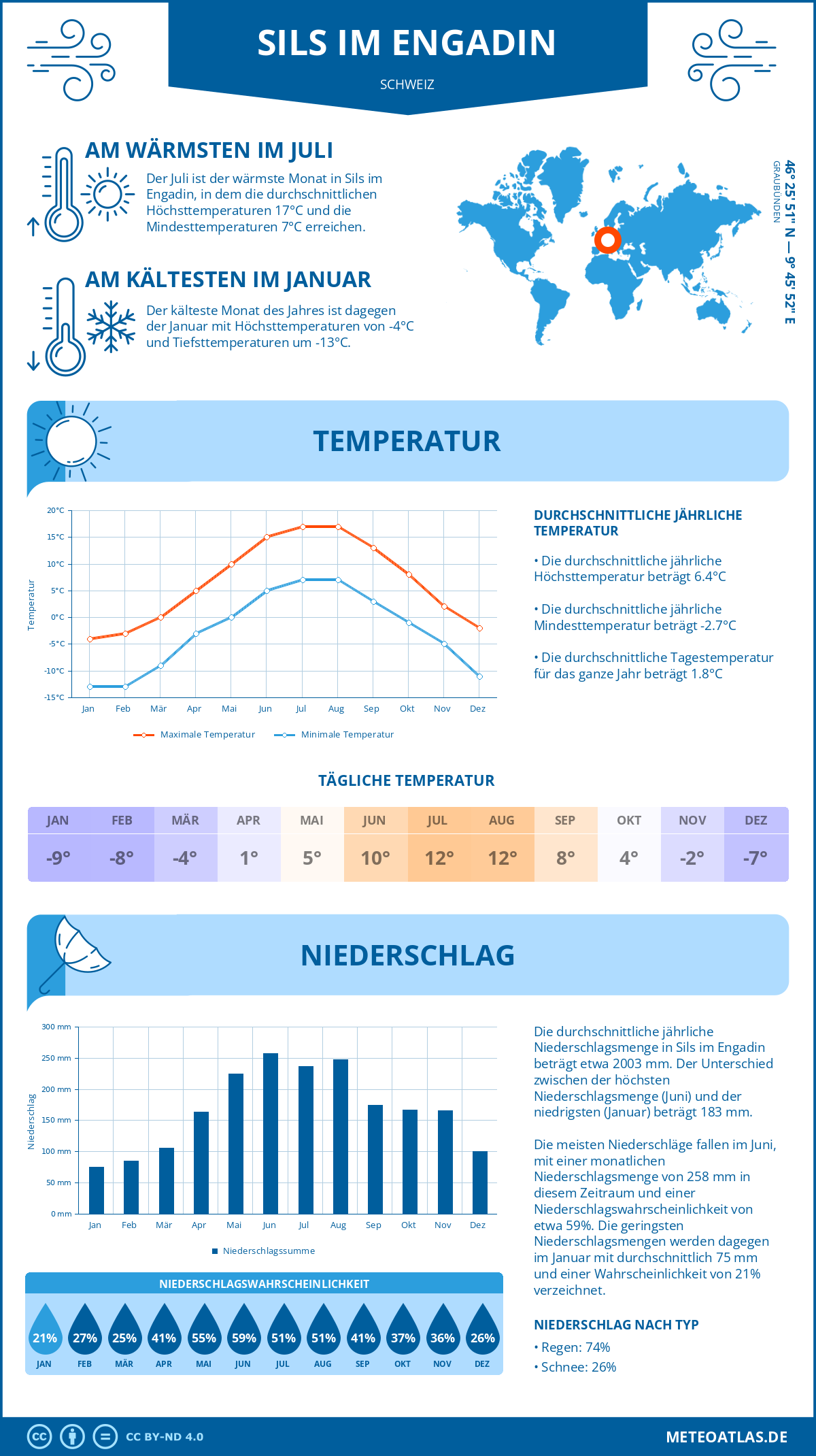 Sils im Engadin (Schweiz) - Wetter und Klima im Jahresverlauf: Durchschnittswerte für Temperatur und Niederschlag
