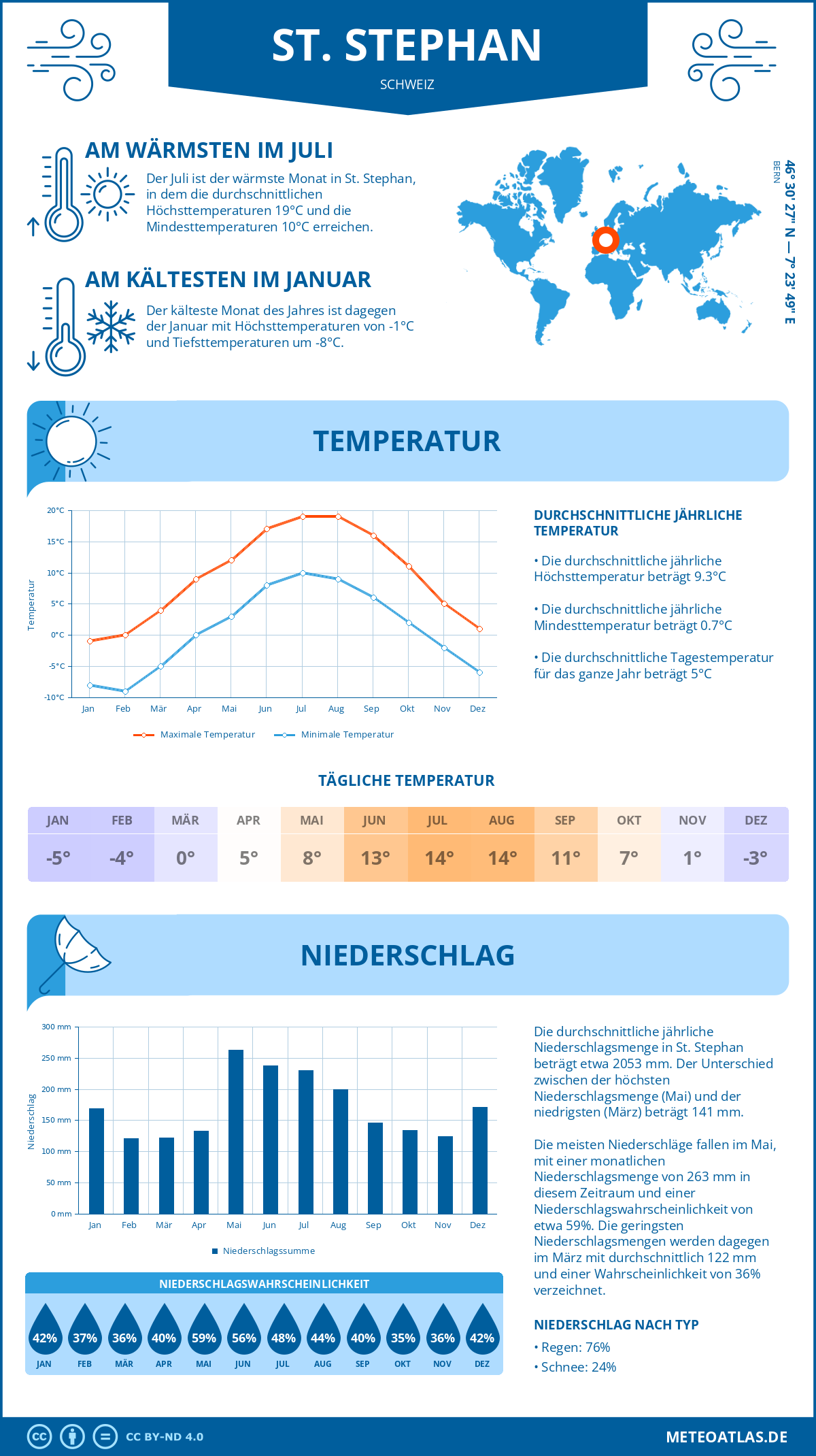 St. Stephan (Schweiz) - Wetter und Klima im Jahresverlauf: Durchschnittswerte für Temperatur und Niederschlag