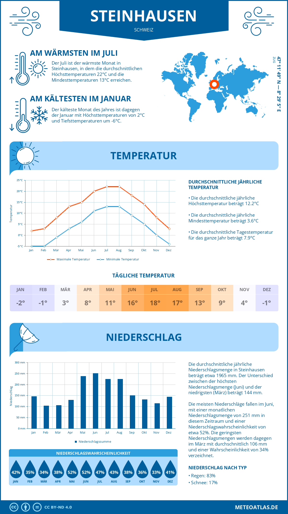 Steinhausen weist eine durchschnittliche Tagestemperatur von 12°C im Jahresmittel auf, während die nächtliche Temperatur auf etwa 4°C. Die durchschnittliche Temperatur über den gesamten Tagesverlauf beträgt 8°C.