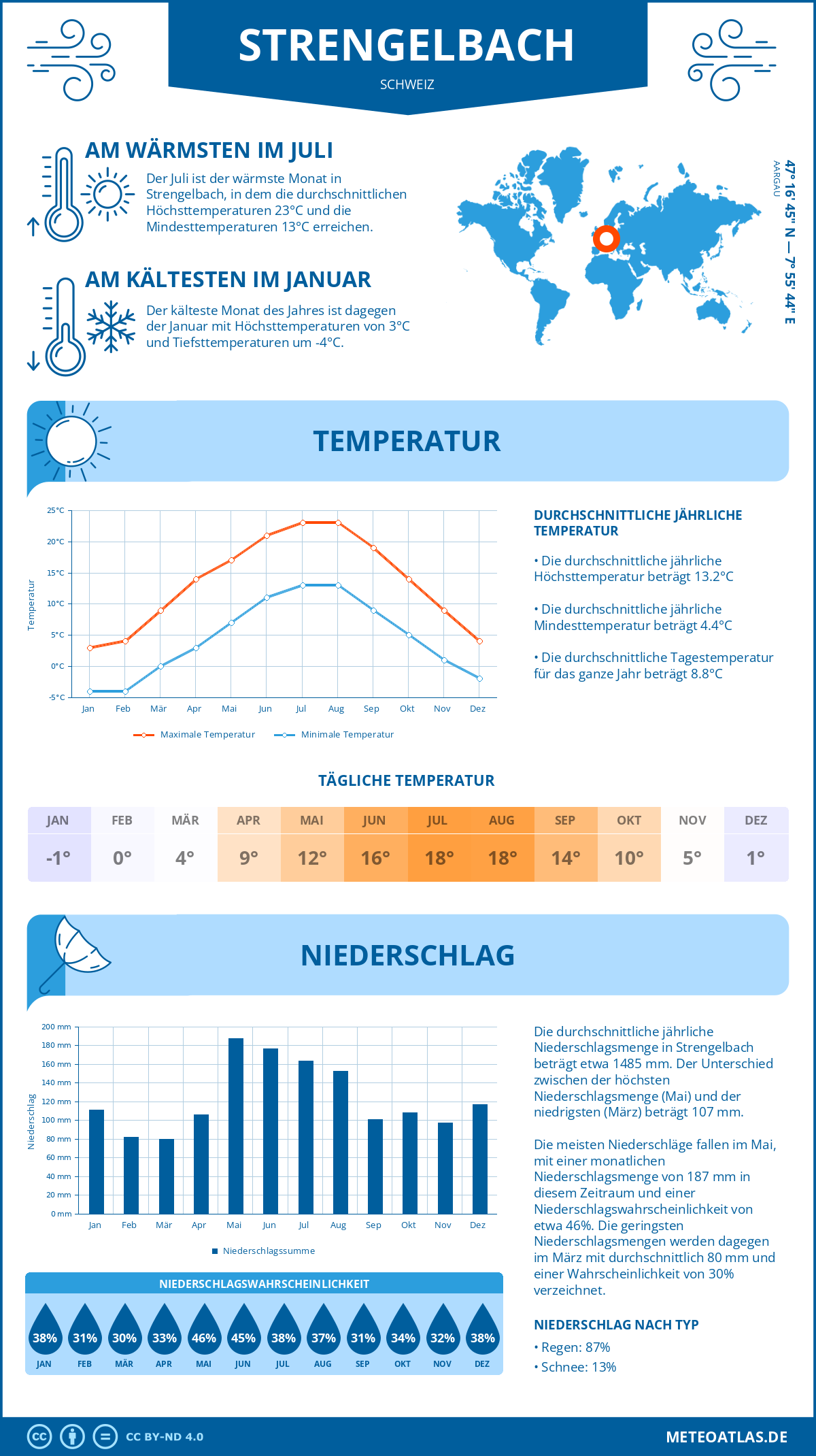 Strengelbach weist eine durchschnittliche Tagestemperatur von 13°C im Jahresmittel auf, während die nächtliche Temperatur auf etwa 4°C. Die durchschnittliche Temperatur über den gesamten Tagesverlauf beträgt 9°C.