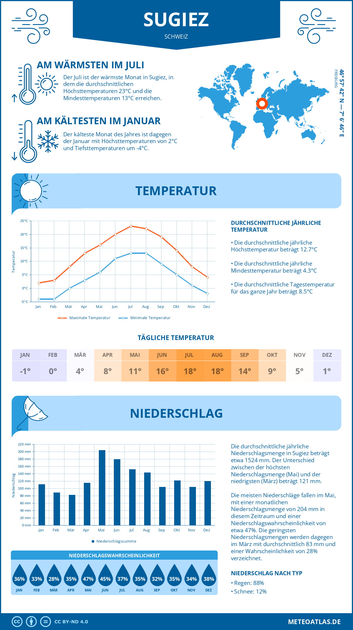 Infografik: Klima sowie monatliche Durchschnittstemperaturen und Niederschläge