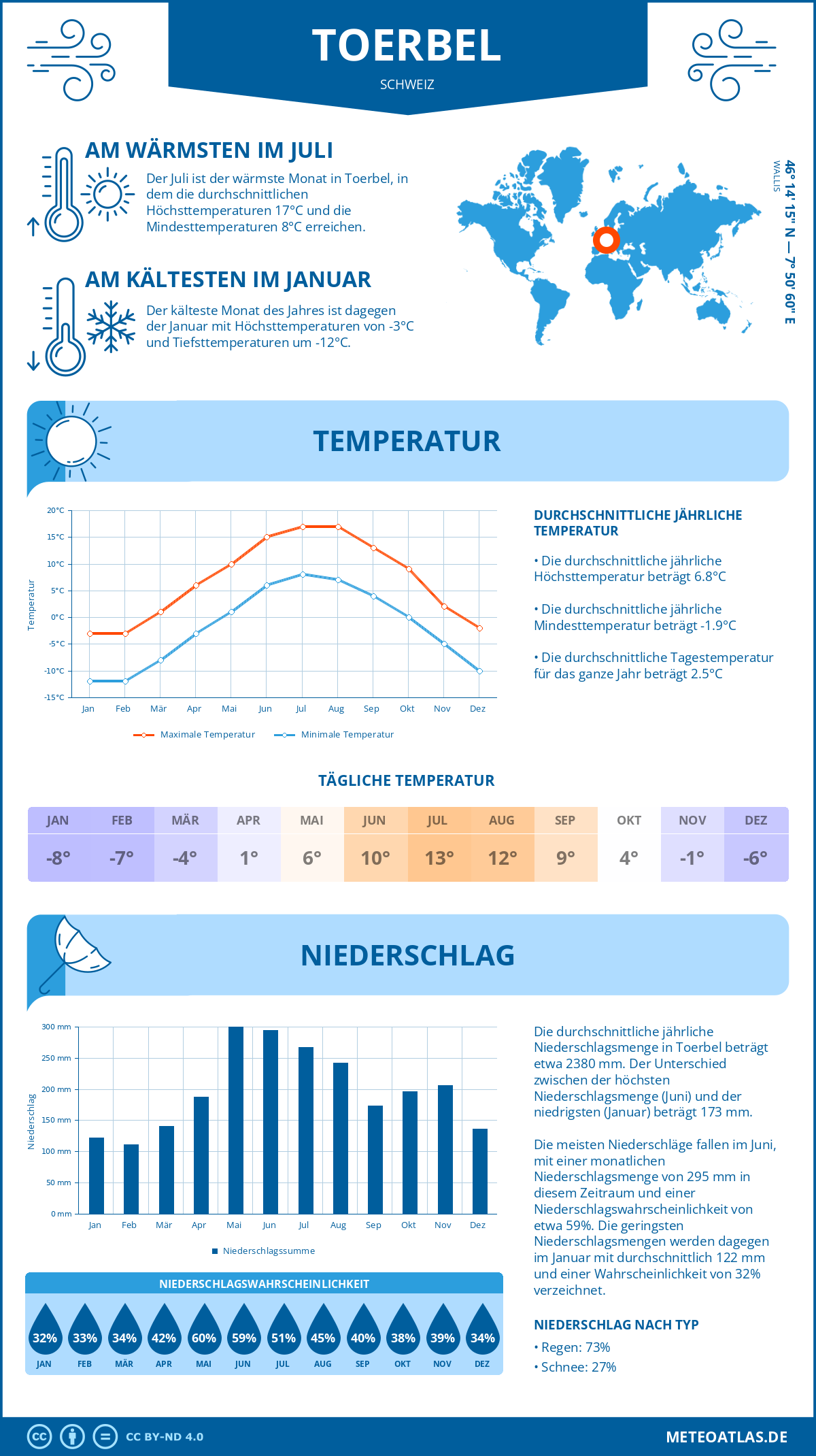 Toerbel (Schweiz) - Wetter und Klima im Jahresverlauf: Durchschnittswerte für Temperatur und Niederschlag