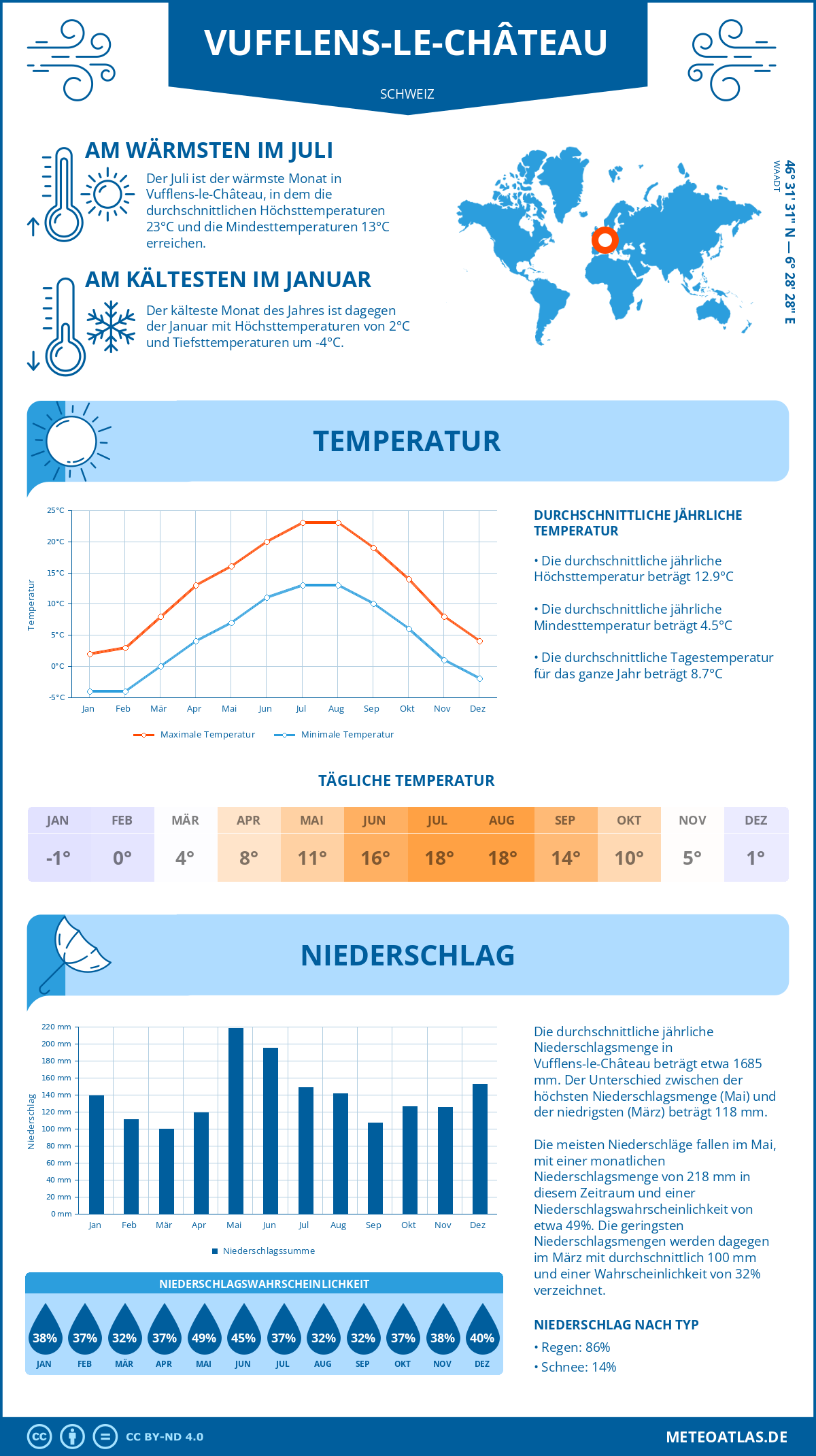 Vufflens-le-Château weist eine durchschnittliche Tagestemperatur von 13°C im Jahresmittel auf, während die nächtliche Temperatur auf etwa 4°C. Die durchschnittliche Temperatur über den gesamten Tagesverlauf beträgt 9°C.